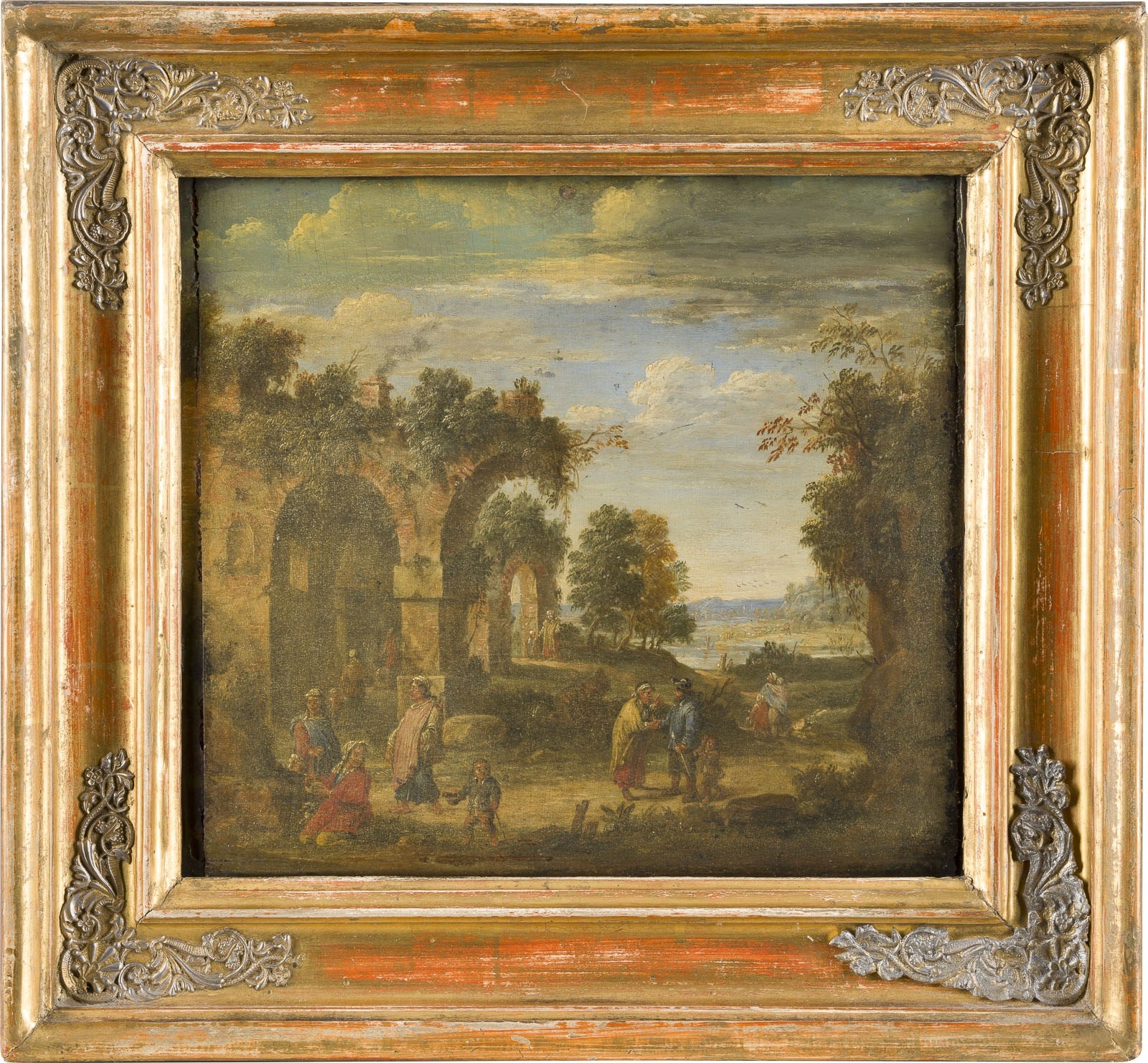 Öl auf fünfteilige Eichenholztafel. 23 x 26 cm (R. 32,5 x 35 cm). Part. altrest., part. Altretuschen, Tafel am rechten und linken Bildrand gebrochen. Rahmen.