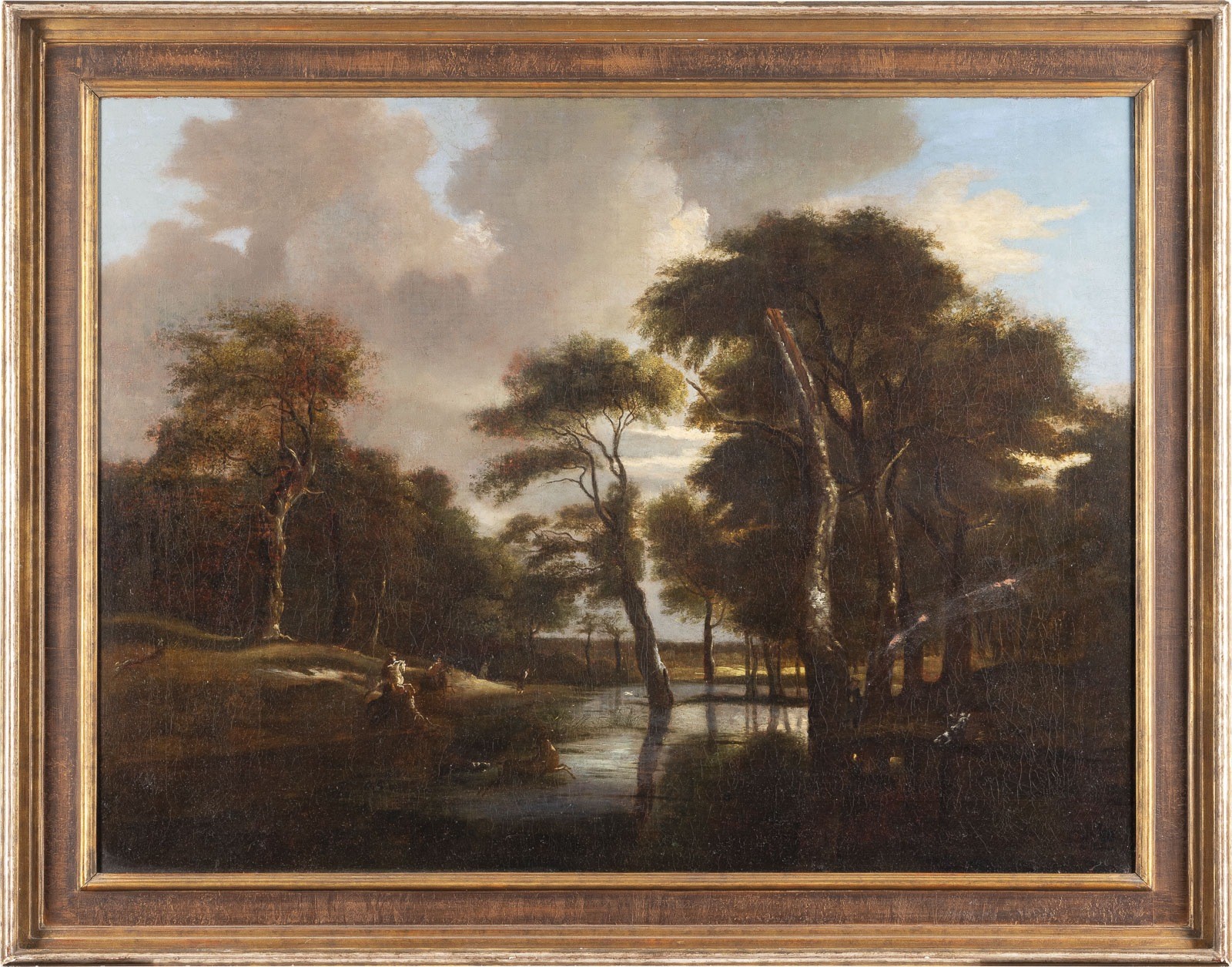 BEWALDETE FLUSSLANDSCHAFT MIT JÄGERN AM WASSER