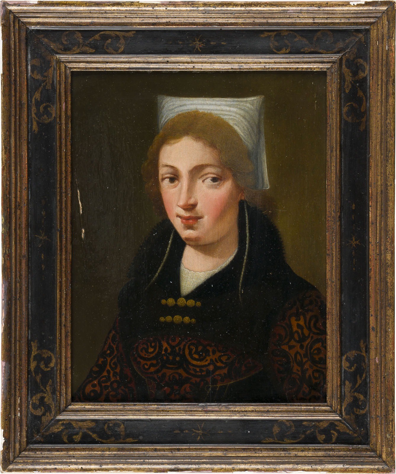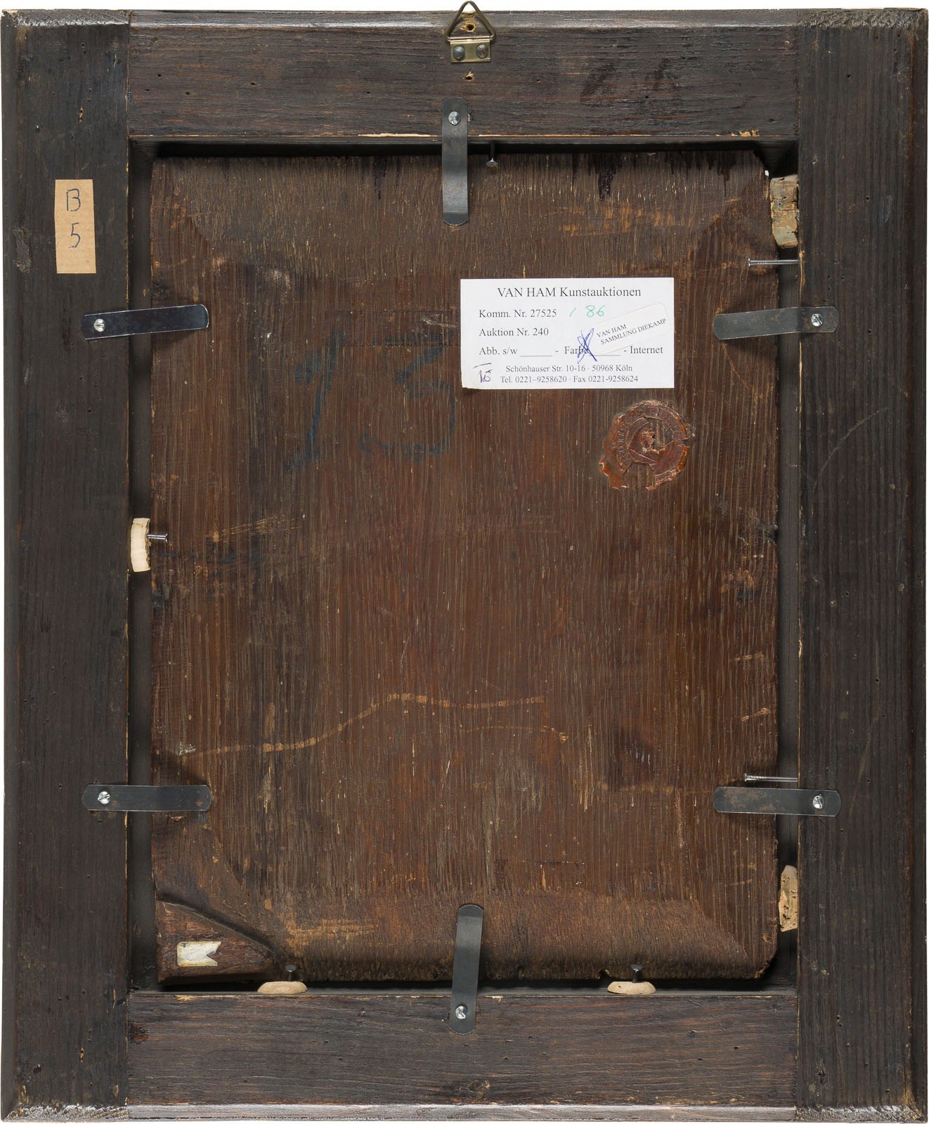 Öl auf Eichenholztafel. 28 x 20,5 cm (R. 36,5 x 30,5 cm). Verso: Altes Wachssigel (ungedeutet). Min. altrest., Altretuschen, Kratzer. Rahmen.