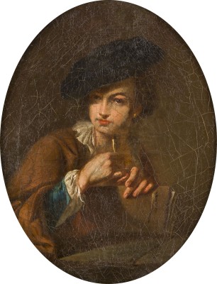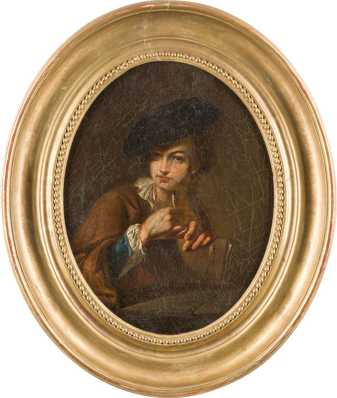 Öl auf Leinwand (altdoubl.). 38 x 30 cm (R. 51 x 44 cm). Verso: Auf Leinwand in alter Schrift Zuweisung an Künstler. Part. min. altrest., part. min. Altretuschen, Craquelé. Rahmen.