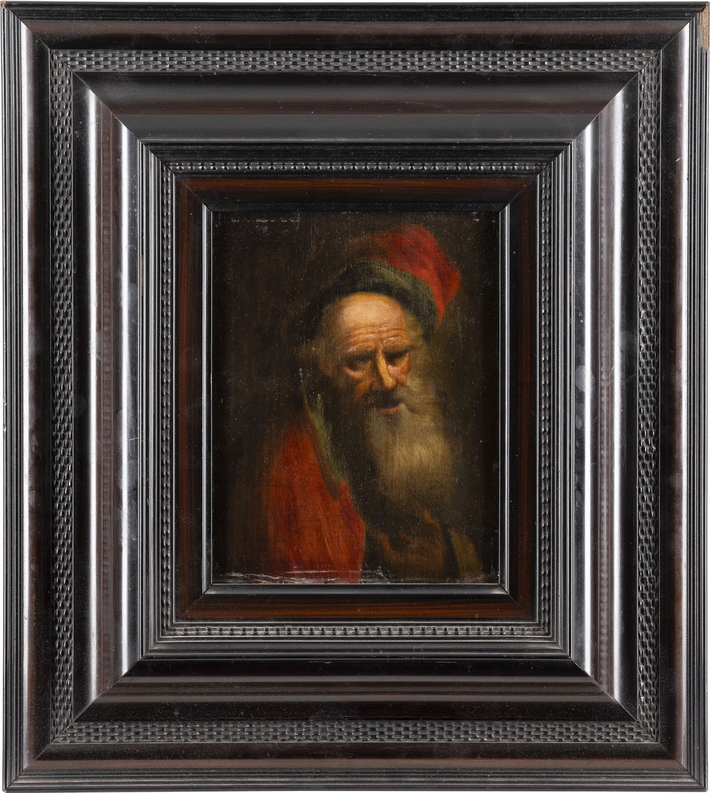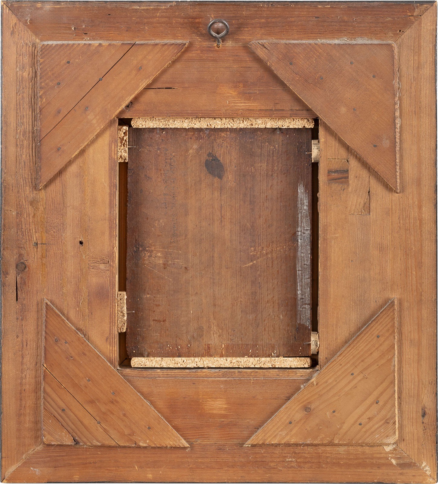Öl auf Holztafel. 23,5 cm x 18,5 cm (R. 50 x 44 cm). Part. min. altrest, leicht fleckig. Rahmen.