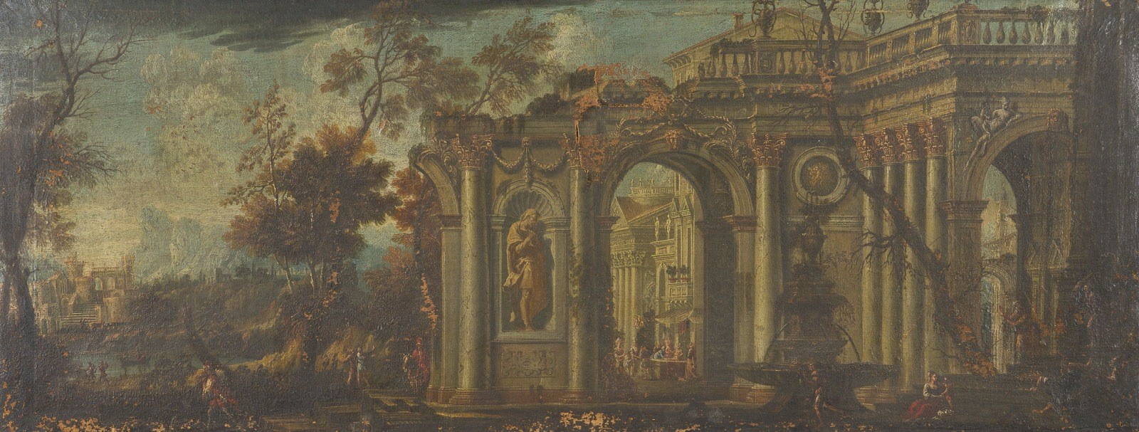Querformatiges Capriccio mit monumentaler antiker Ruinenarchitektur. In einer idealisierten Landschaft erhebt sich ein architektonisches Ensemble aus Säulen, Bögen und plastischem Figurenschmuck, staffageartig belebt durch kleine Personengruppen. Die Komposition verbindet klassische Architekturelemente mit einer atmosphärisch dichten Landschaftsdarstellung und folgt damit der im 18. Jahrhundert beliebten Tradition der vedutenhaften Phantasielandschaften. Gedämpfte, erdige Farbigkeit mit betonter Hell-Dunkel-Modellierung. Trotz des beeinträchtigten Erhaltungszustands bleibt die ursprüngliche Raumwirkung gut nachvollziehbar.