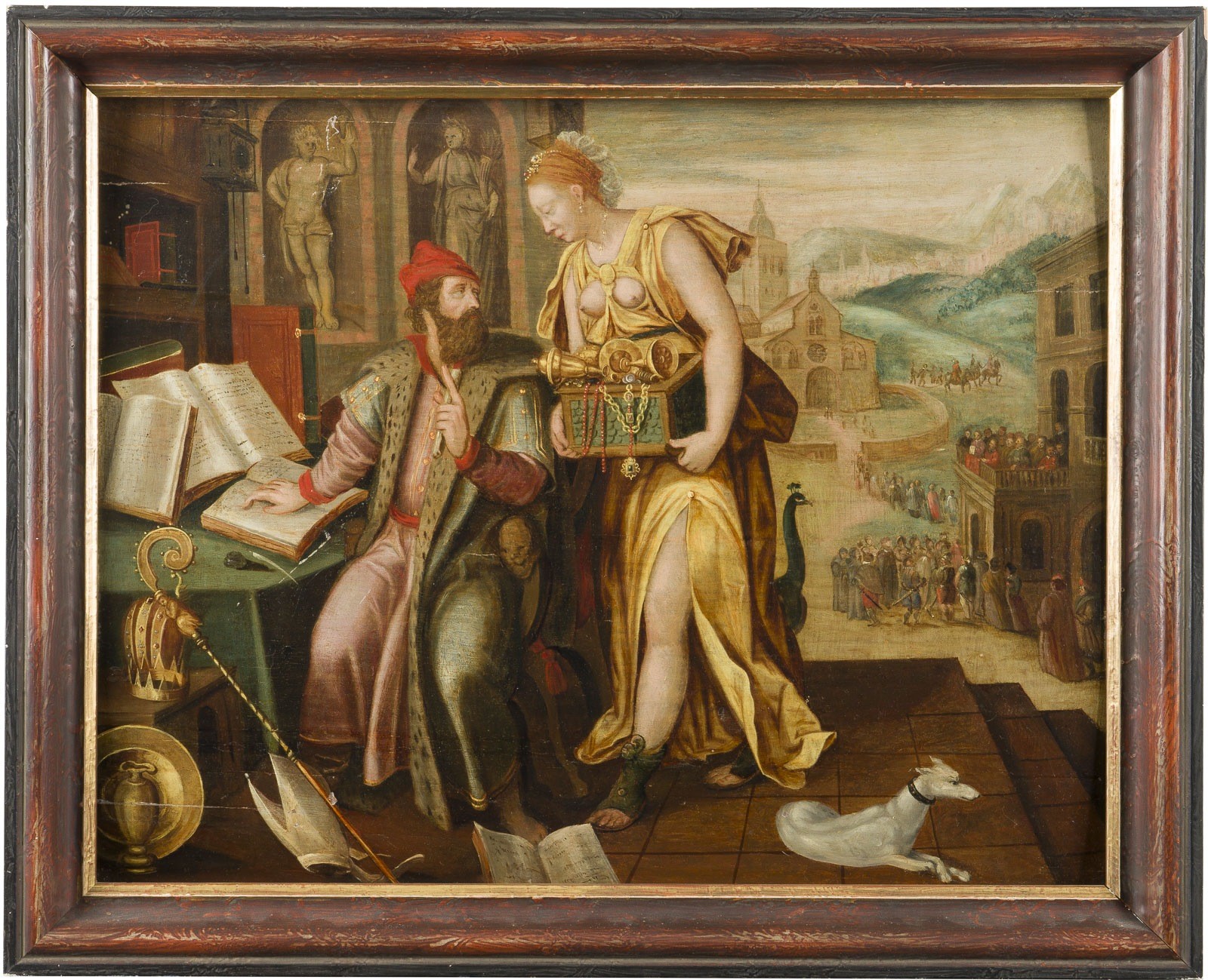 Öl auf Nadelholztafel (teilweise parkettiert). 44 x 55 cm (R. 515 x 63 cm). Min. altrest., min. Altretuschen, rest. alte Spannungsrisse. Rahmen.