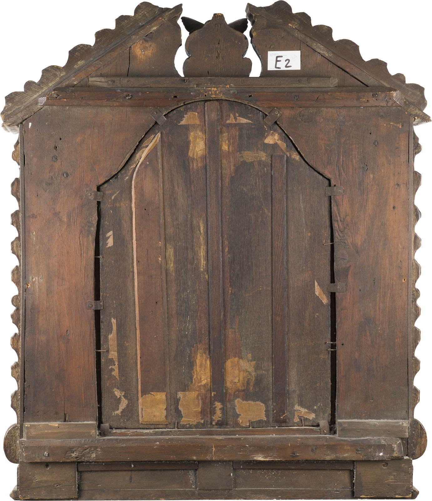 Holz. Architektonischer Aufbau mit gedrehten Salomonischen Säulen, gesprengtem Giebel und