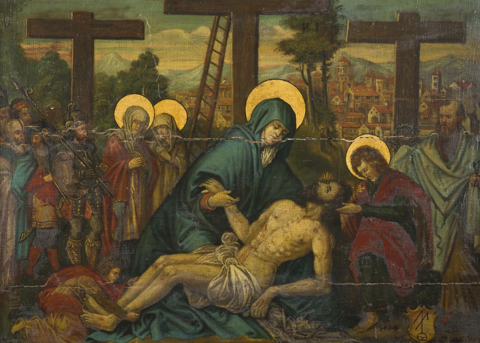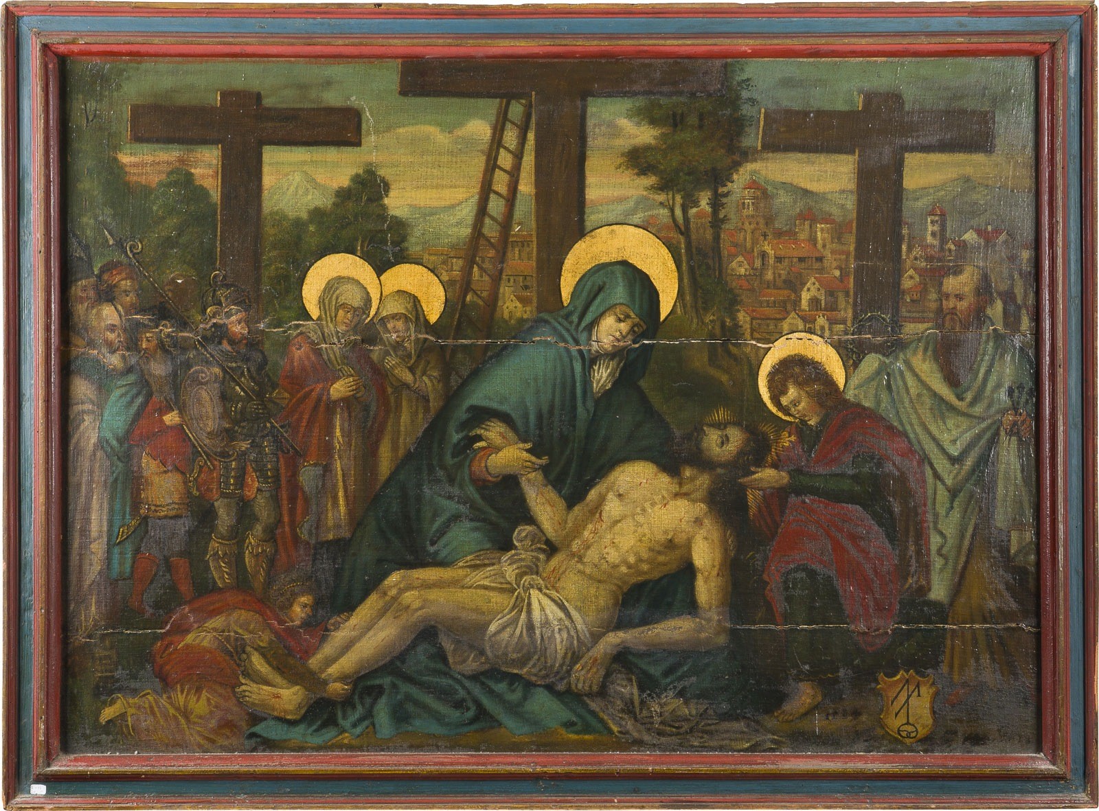 Öl auf Leinwand auf Holztafel (Rückseite mit Holzleisten verstärkt). 84,5 x 114 cm. Unten rechts monogrammiert 'AM' legiert und datiert 1584. Altrest., Altretuschen, Risse, Craquelé, verschmutzte Oberfläche. Rahmen.
