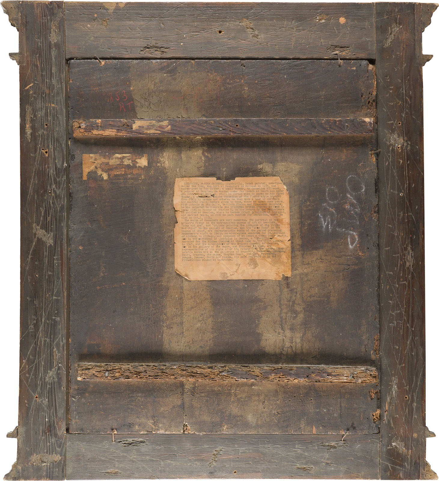 Öl auf Eichenholztafel (zwei Rückseitensponki). 68 x 56,5 cm (R. 87,5 x 81 cm). Auf der Vorderseite des Rahmens Metallplakette bezeichnet mit 'Maerten v. Heemskerk 1498 -
