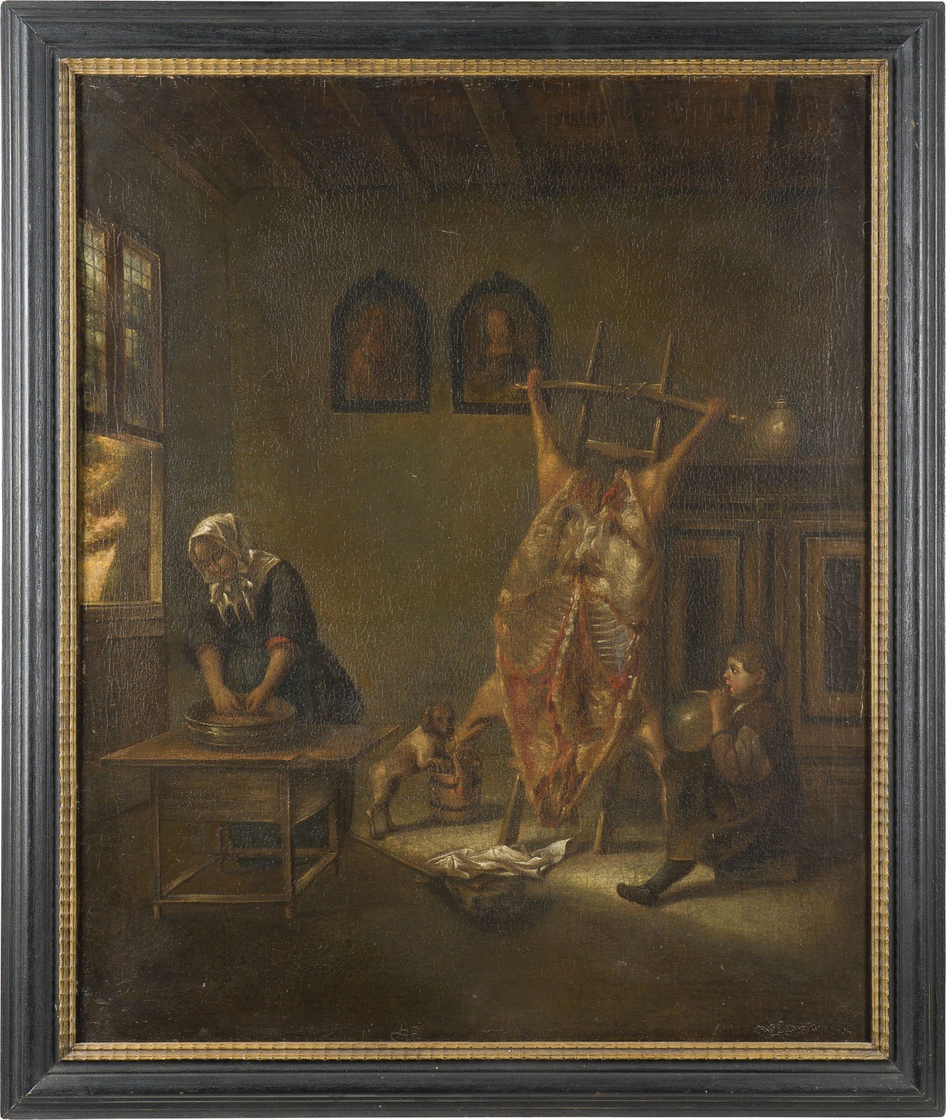 Öl auf Leinwand (altdoubl.). 76 x 63 cm (R. 86 x 72 cm). Verso: Altes Papierlabel mit Zuschreibung an Jan Steen: 'Nr. 5 Jan Steen Schweineschlachtung'. Part. leicht altrest., verschmutzte Oberfläche. Rahmen.