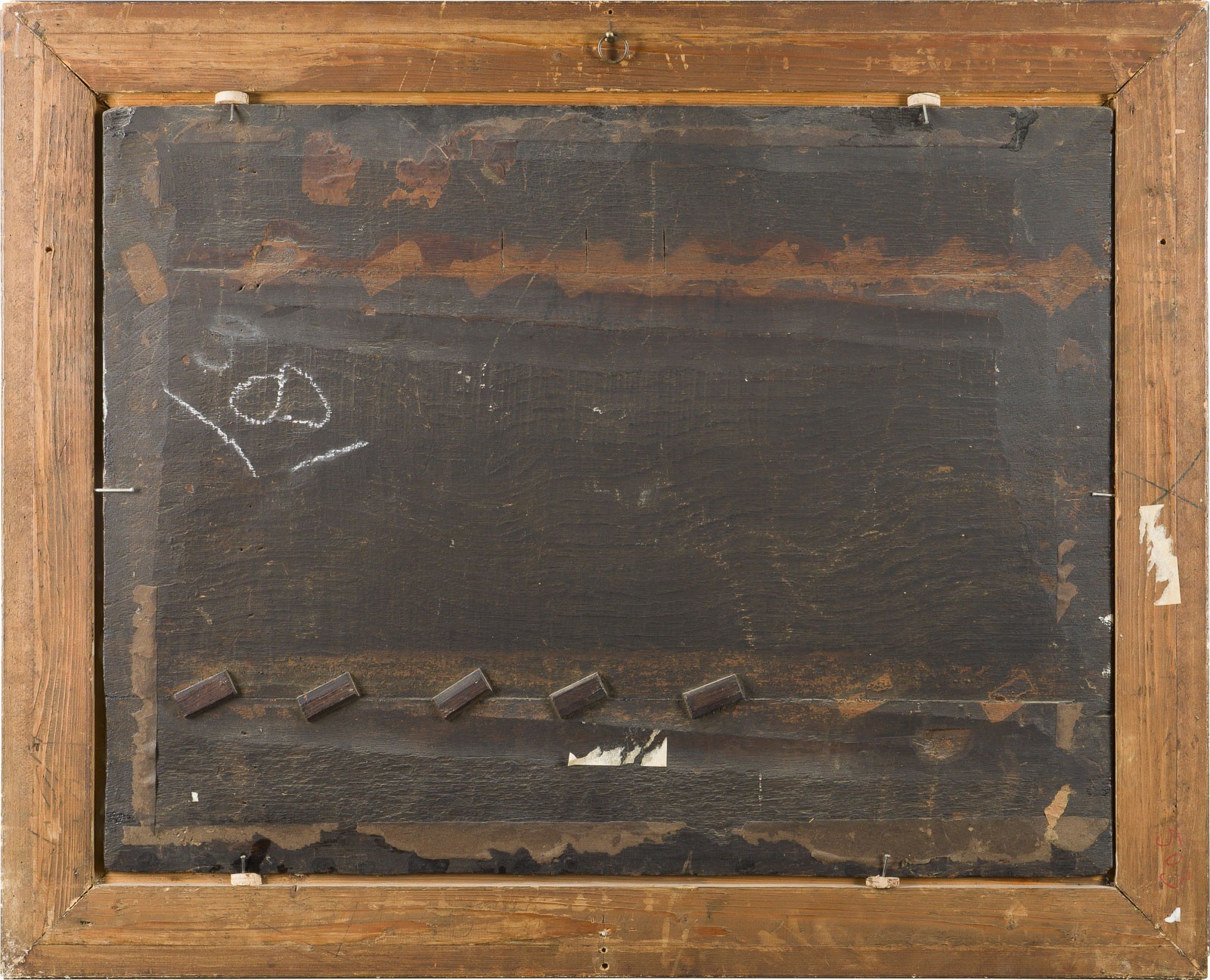 Öl auf Eichenholztafel. 54 x 71 cm (R.69 x 85 cm). Verso: Reste eines alten Papierlabels. Part. altrest., Altretuschen. Rahmen.