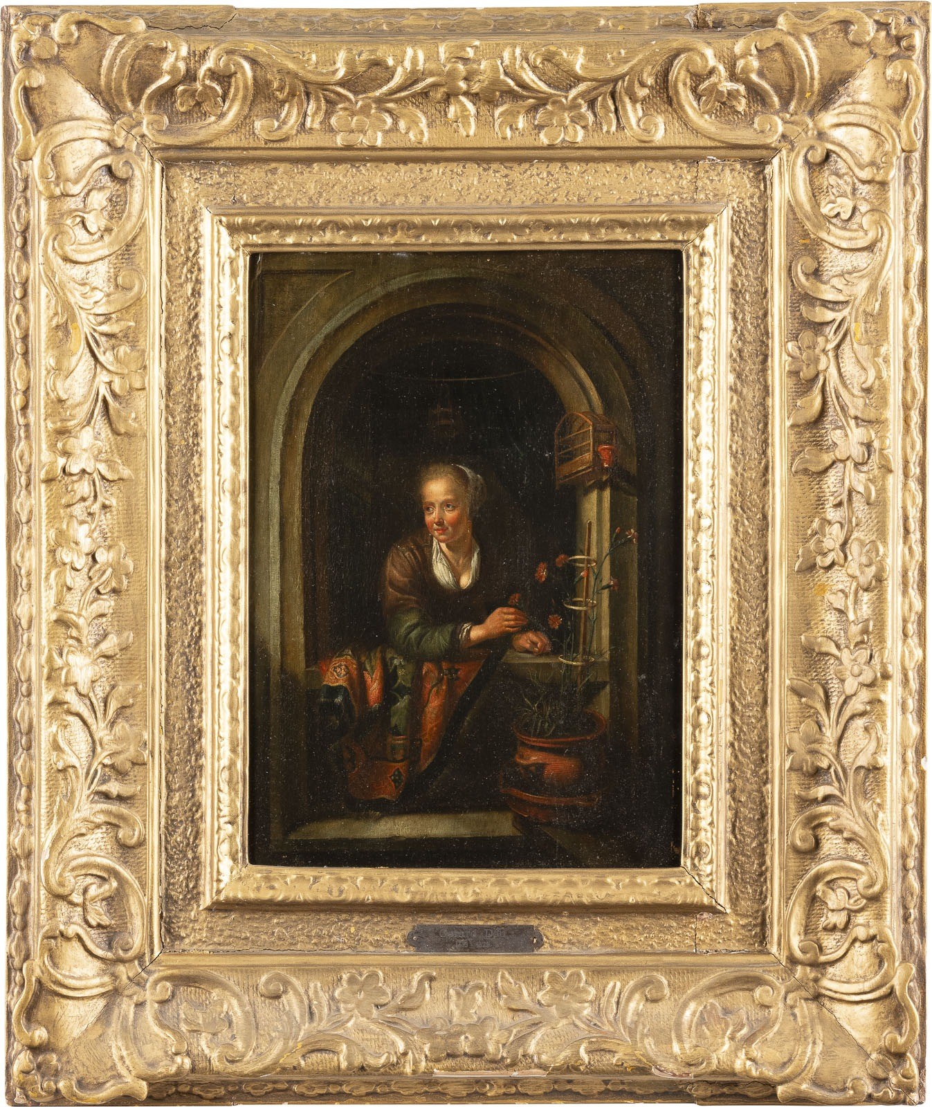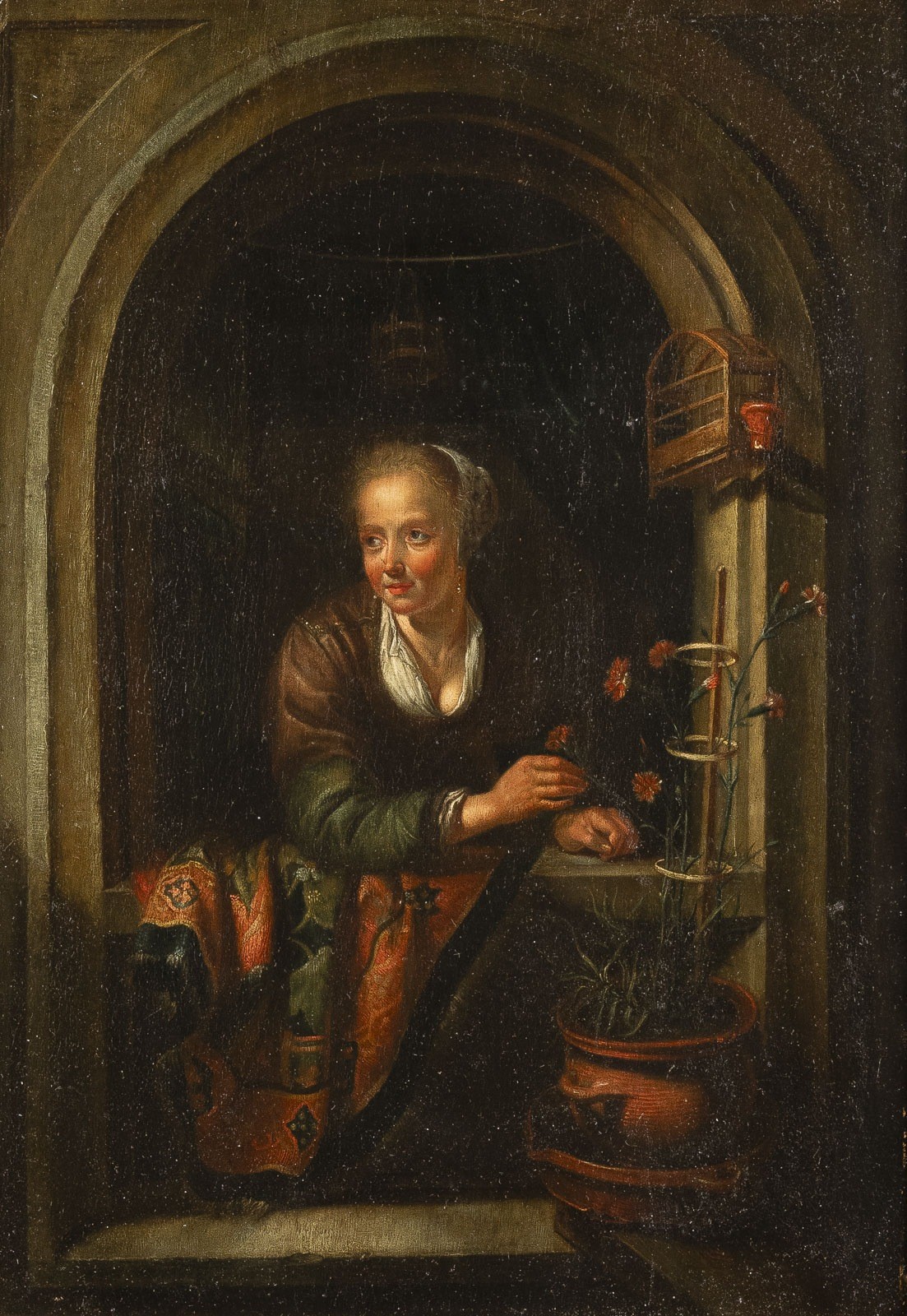 MÄDCHEN AM FENSTER, EINE NELKE PFLÜCKEND