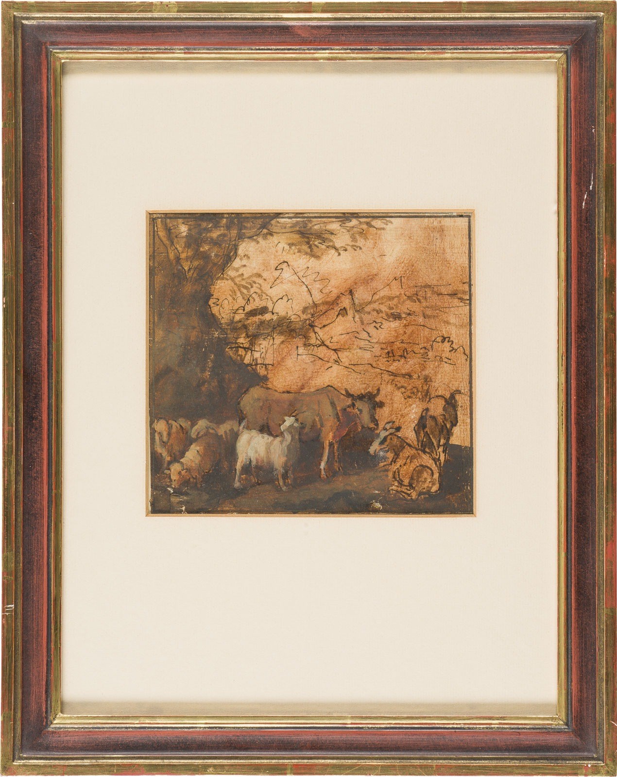 Pinsel in Schwarz und Mischtechnik auf Büttenpapier. Sichtmass: 15,3 x 16,5 cm, Rahmenmass: 39 x 31 cm. Linke untere Ecke min. besch. und rest., halb recht unten min. Farbverlust. Im Passepartout und hinter Glas gerahmt.