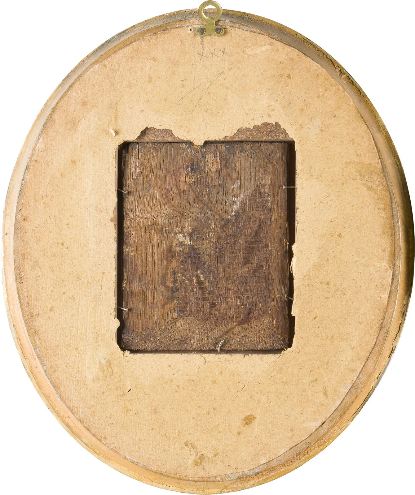 Öl auf Eichenholztafel. 13,5 x 10,5 cm (R. 30,5 x 26 cm). Part. min. rest. Sehr dekorative Rahmen des 19. Jh.