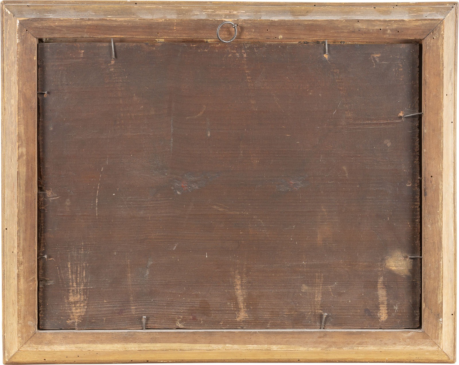 Öl auf Nadelholztafel. 31 x 40,5 cm (R. 39 x 48 cm). Part min. Farbverluste, stark verschmutzte Oberfläche. Rahmen.