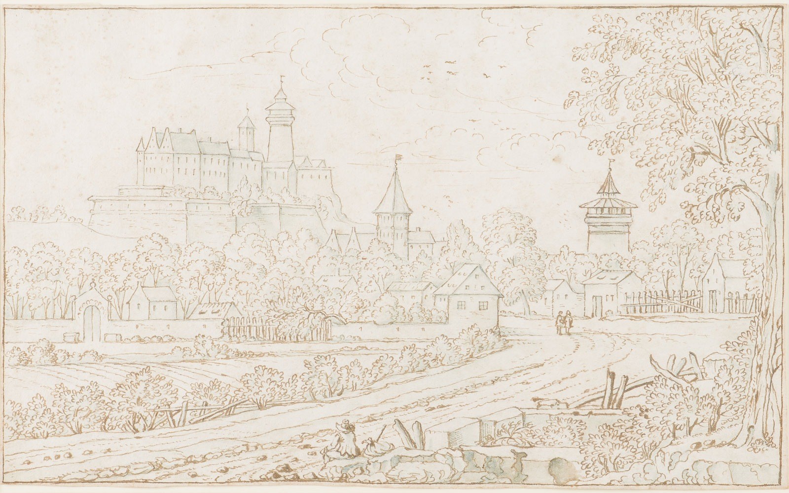 STADTLANDSCHAFT MIT BEFESTIGTER BURGANLAGE, WEG UND STAFFAGEFIGUREN