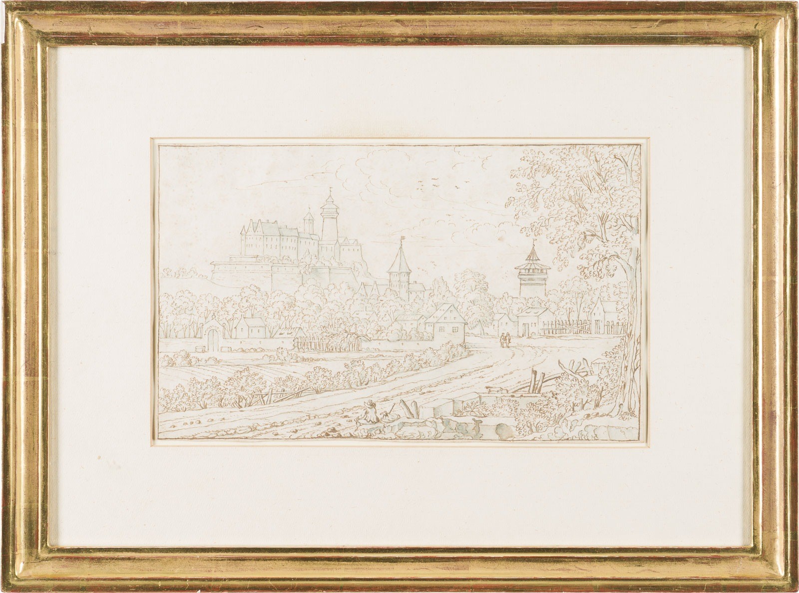 Feder in braun und olivgrün, leicht laviert. Blattmass: 18 x 29 cm, Rahmenmass: 35 x 47 cm. Min. stockfleckig. Im Passepartout und hinter Glas gerahmt.