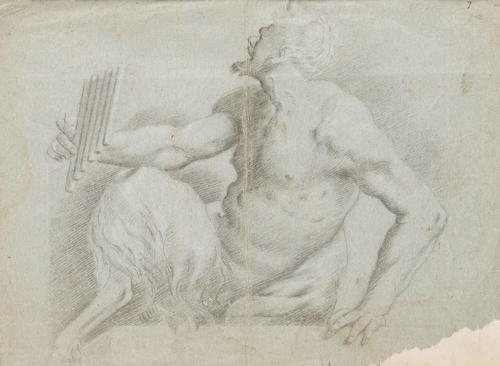 Kräftige, manieristisch aufgefasste Studie eines Pans mit gedrehtem Oberkörper und plastischer Modellierung durch dichte Schraffuren. Die Zeichnung steht stilistisch in engem Zusammenhang mit der römisch-florentinischen Akademietradition der Spätrenaissance, im Umkreis von Federico Zuccari und Girolamo Muziano. Das Wasserzeichen der drei Mondsicheln in abnehmender Größe - häufug für italienisches Papier, wahrscheinlich Rom oder Latium, spätes 16. Jahrhundert (ca. 1570-1600) -unterstützt eine Zuschreibung in den Umkreis von Girolamo Muziano bzw. die römische Zeichentradition dieser Zeit.