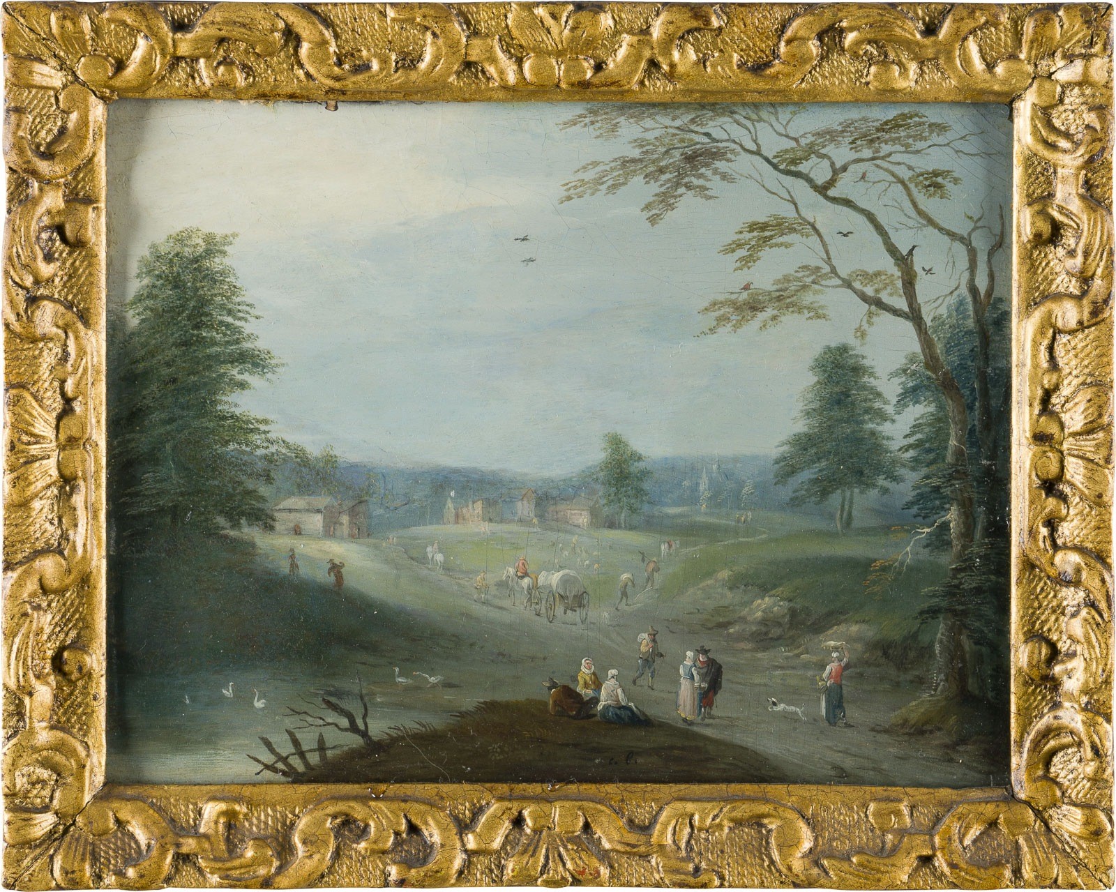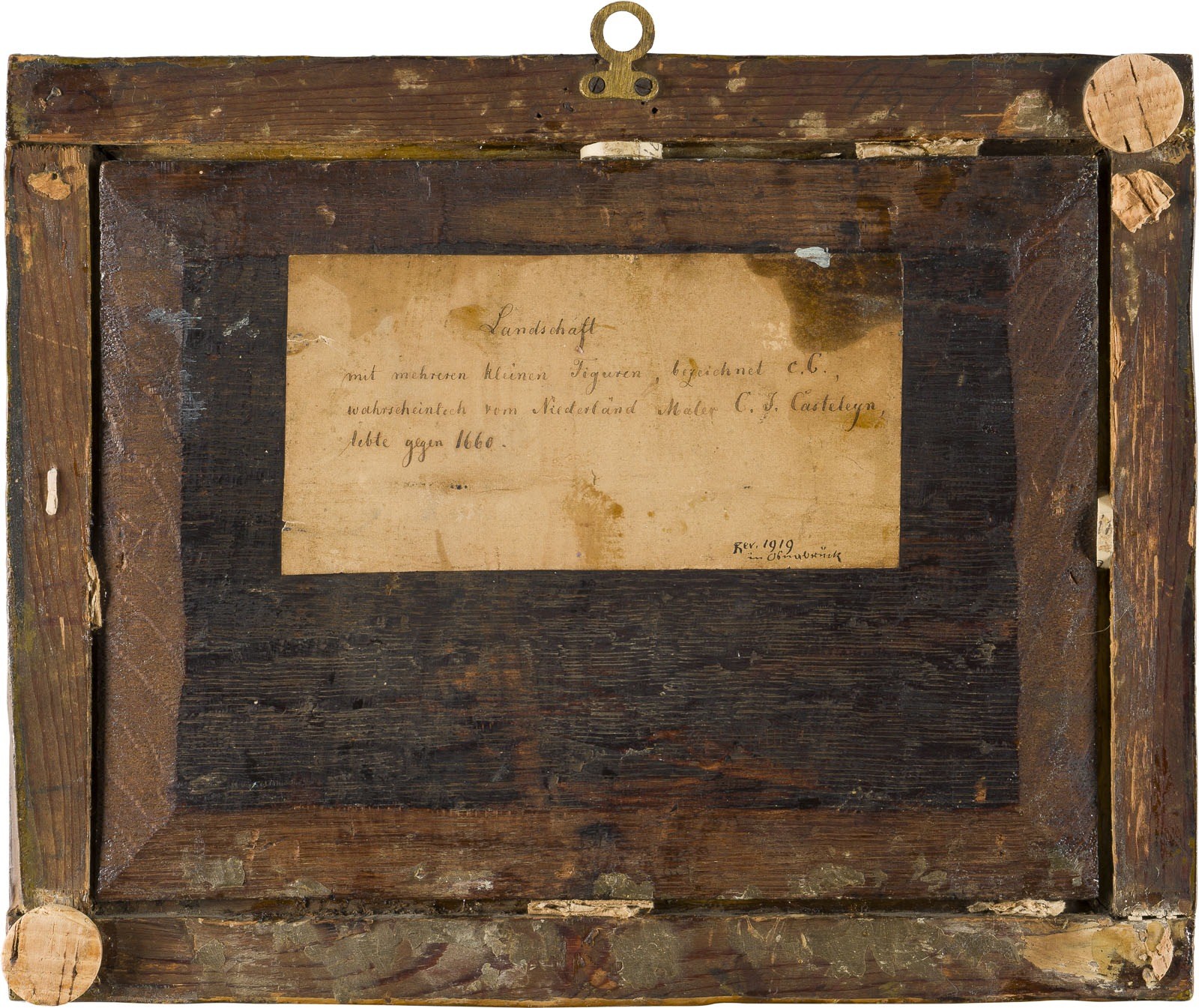Öl auf Holztafel. 18 x 24,5 cm (R. 24 x 29,5 cm). Unten mittig monogrammiert, möglicherweise von späterer Hand 'C.B.'. Verso: In alter Schrift auf altem Papierlabel Monogrammist 'C. J. Casteleyn' und mögliche Lebzeit des Künstlers 1660. Part. min. altrest., Altretuschen. Rahmen.