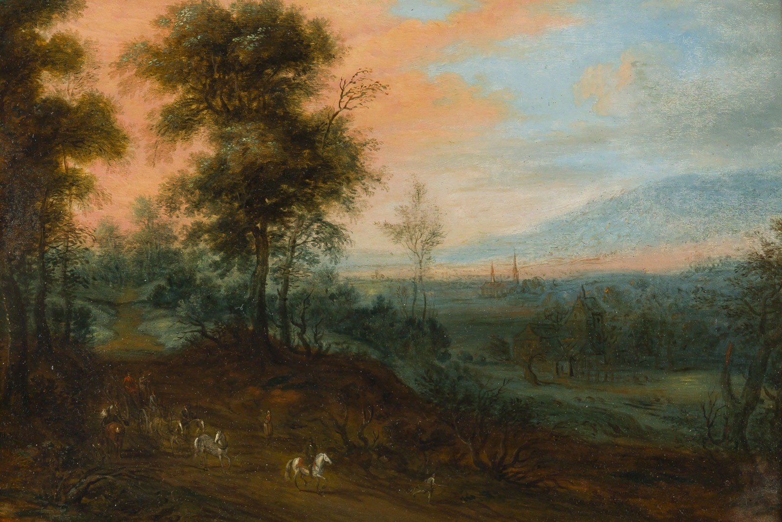 WALDLANSCHAFT MIT BAUERN UND REITERN IN DER ABNEDDÄMMERUNG