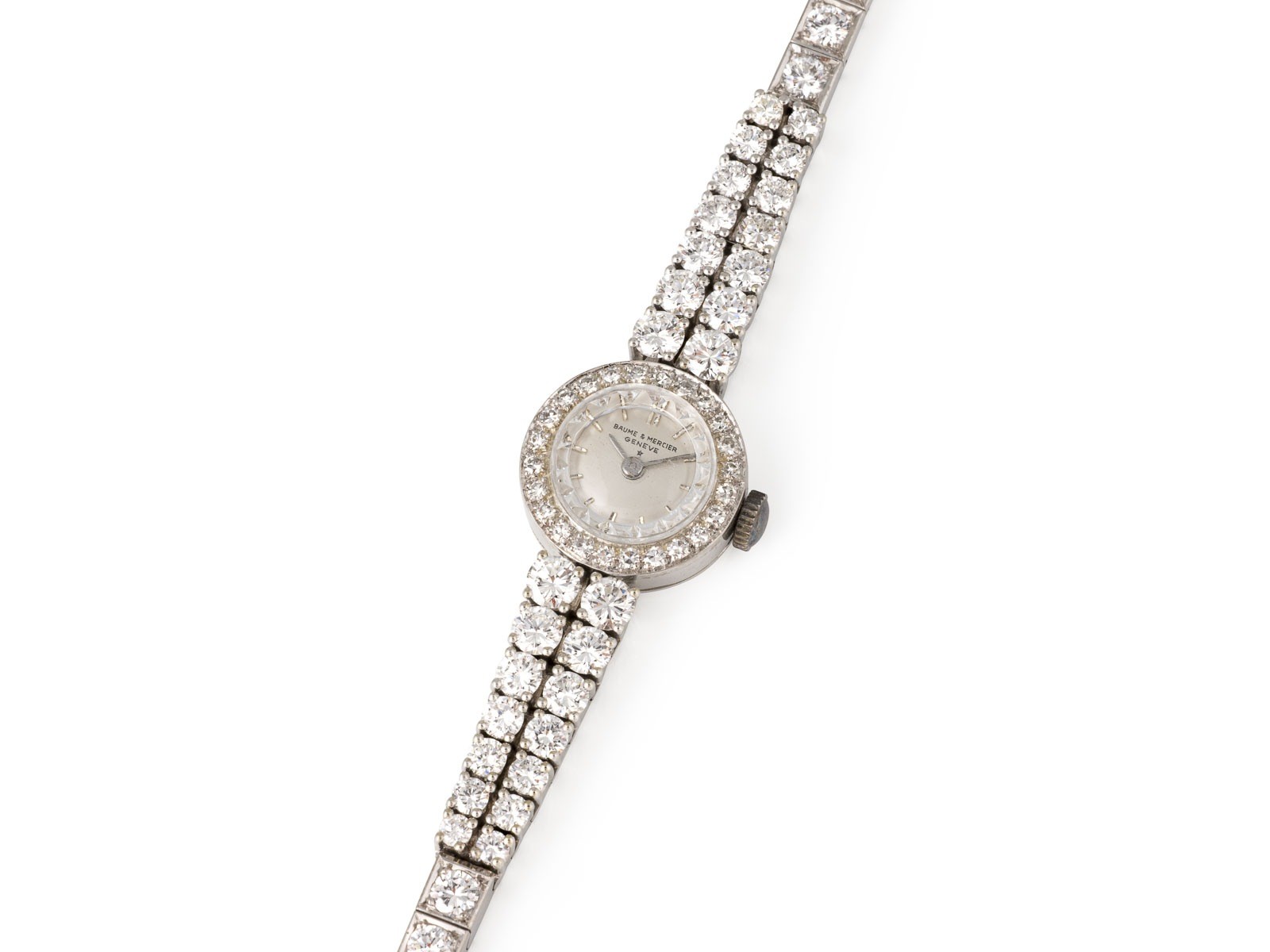 Handaufzug. GG 750. L.: ca. 16,5 mm, D.: ca. 15,4 mm. Vintage Damenuhr von Baume & Mercier, besetzt mit ca. 80 Diamanten im Brillant- und