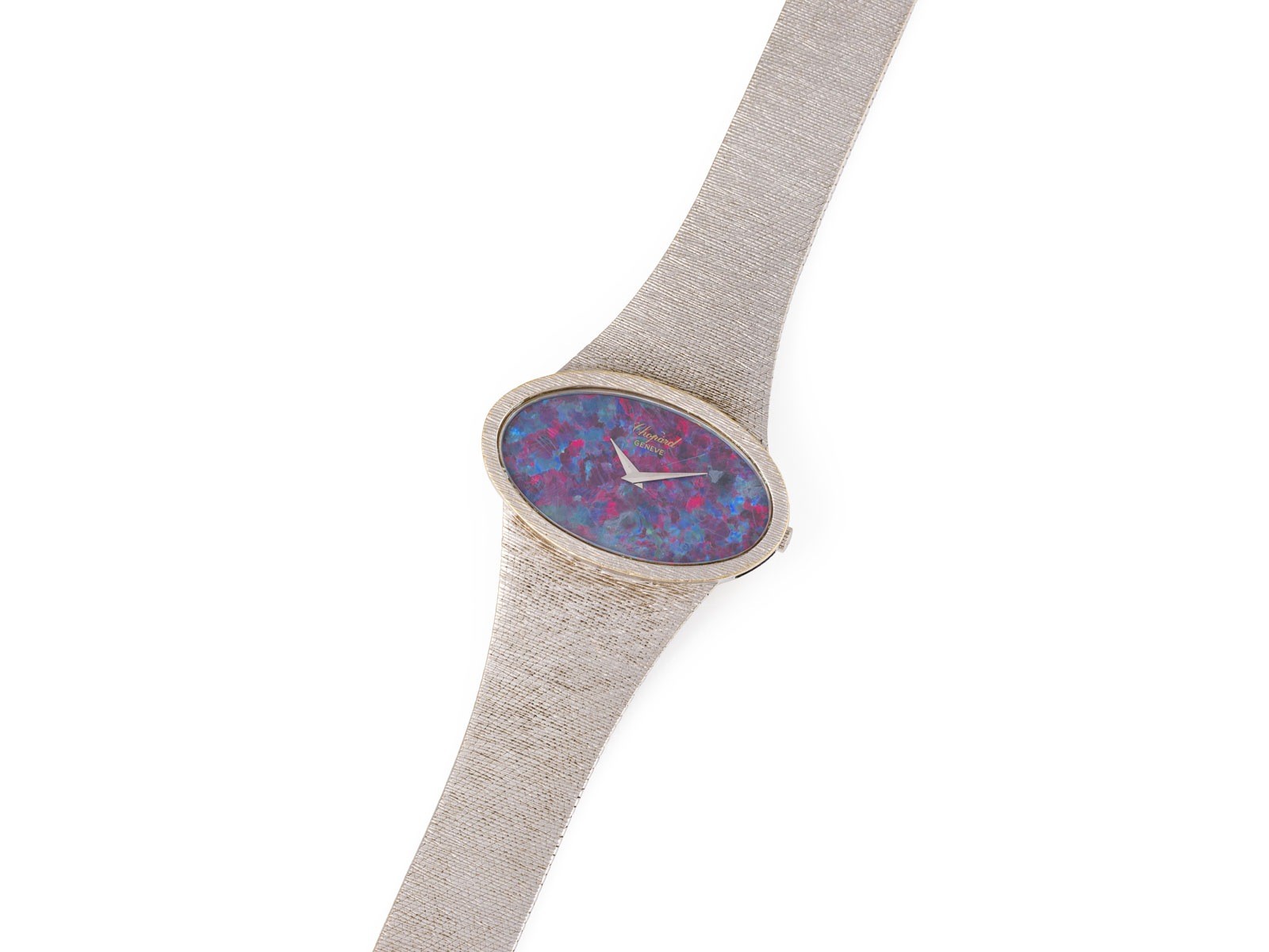 Handaufzug (Nicht auf Funktion geprüft). WG 750. Maße: L: ca. 18,5 cm. Gehäuse: ca. 25,7 mm x 41,6. Ges.-Gew.: ca. 91,3 g. Inkl. orig. Rechnung aus 1987. Vintage Armbanduhr von 'Chopard' aus Weißgold. Verstellbare Faltschließe.
