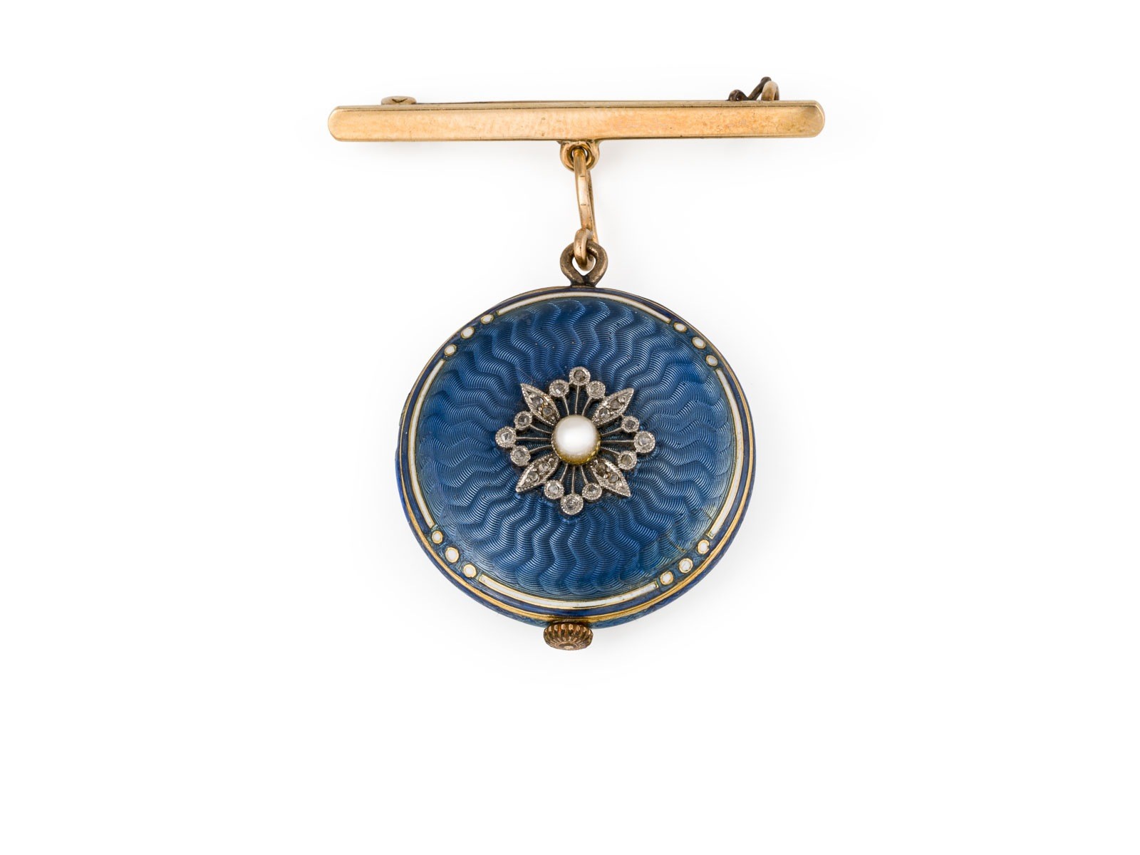 Handaufzug (Nicht auf Funktion geprüft). GG 585 (Brosche). Ges.-Gew.: ca. 16,3 g. Broschenuhr mit verblasstem Ziffernblatt. Guillochierte, blaue Emaille. Blumendekor mit