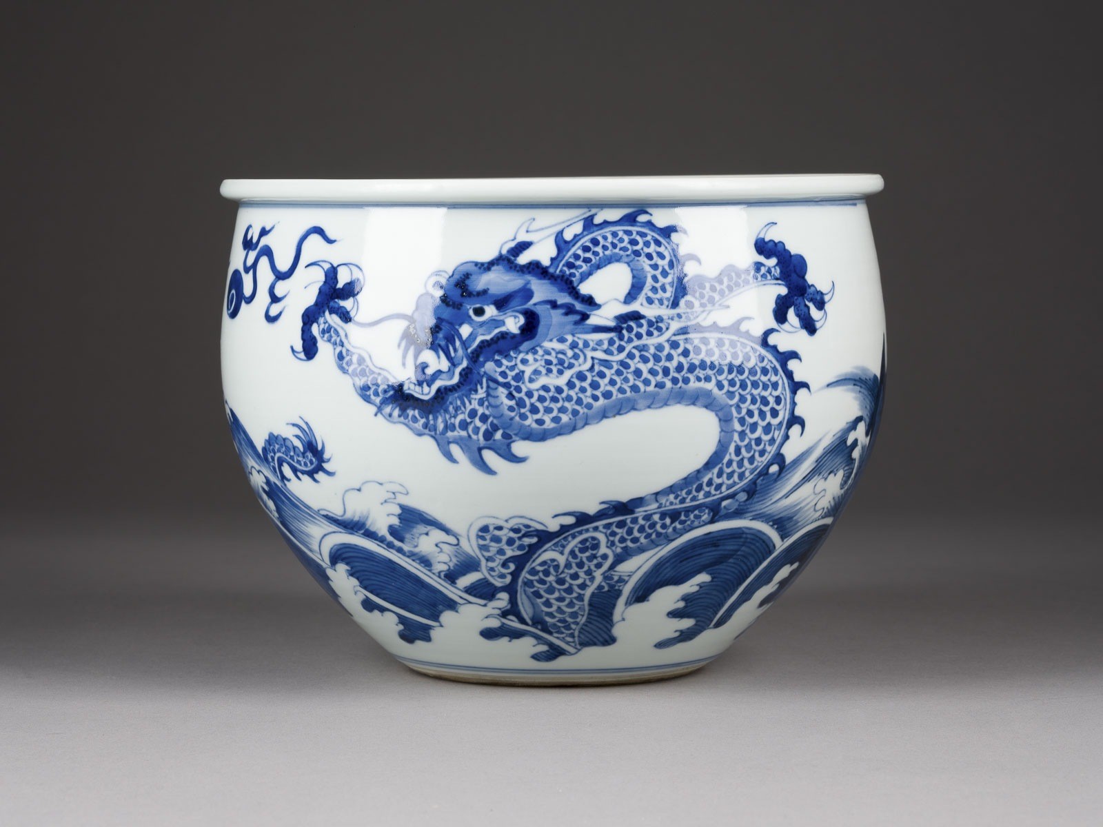 EIN BLAU-WEISSER JARDINIERE MIT DRACHENDARSTELLUNG