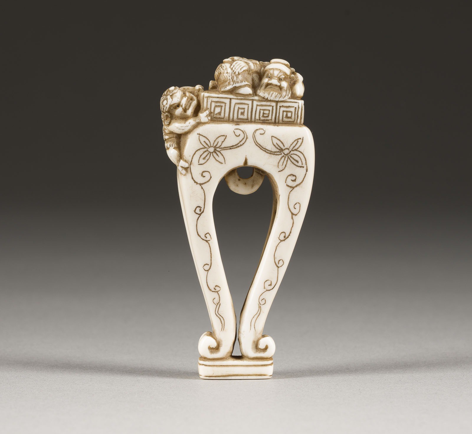 EIN GESCHNITZTES NETSUKE EINES HOHEN CHINESISCHEN TISCHES MIT SHOKI UND ONI AUS ELFENBEIN