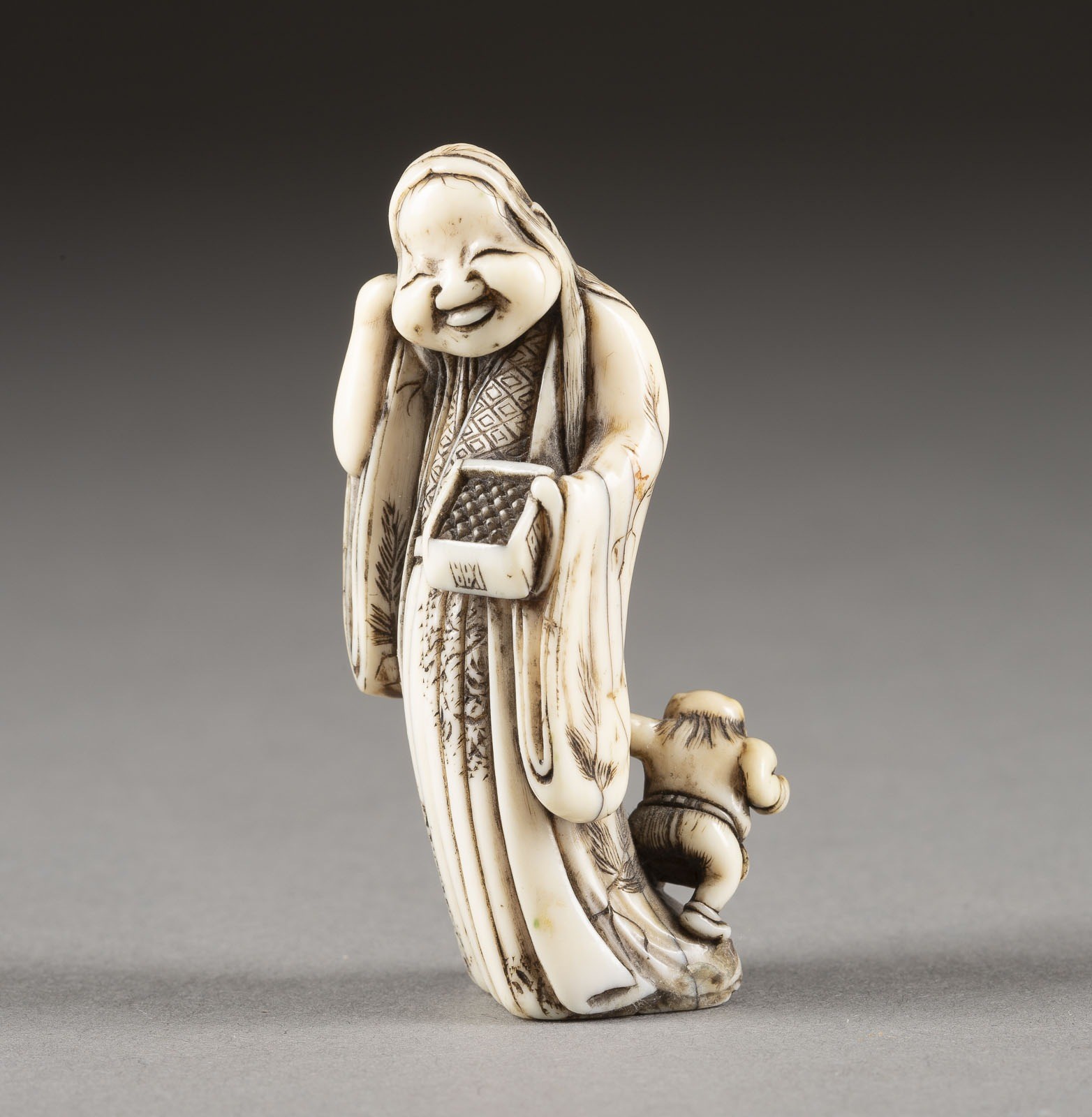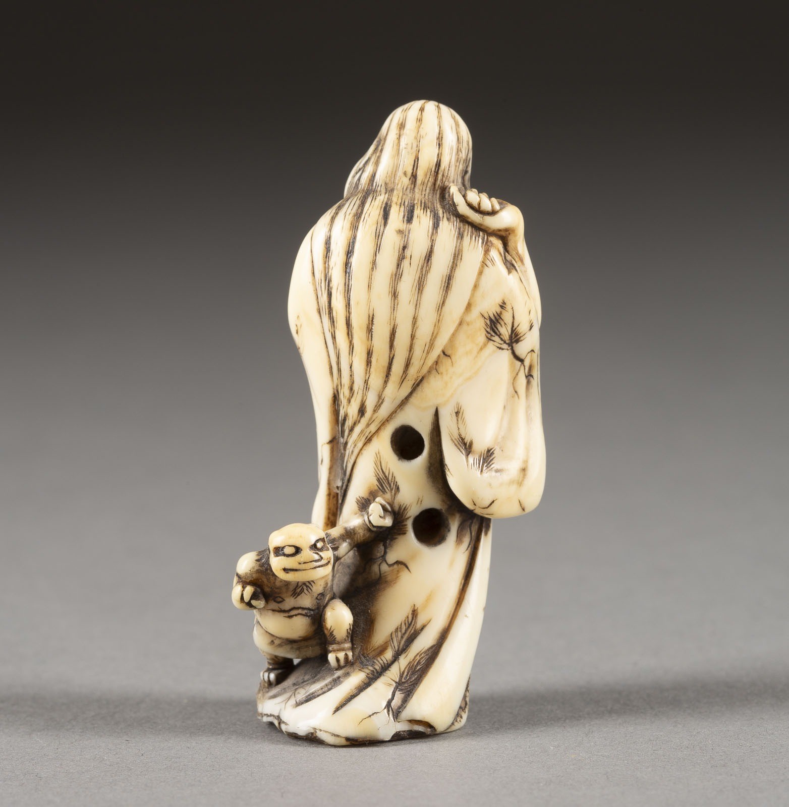 EIN GESCHNITZTES NETSUKE VON OKAME MIT ONI AUS ELFENBEIN