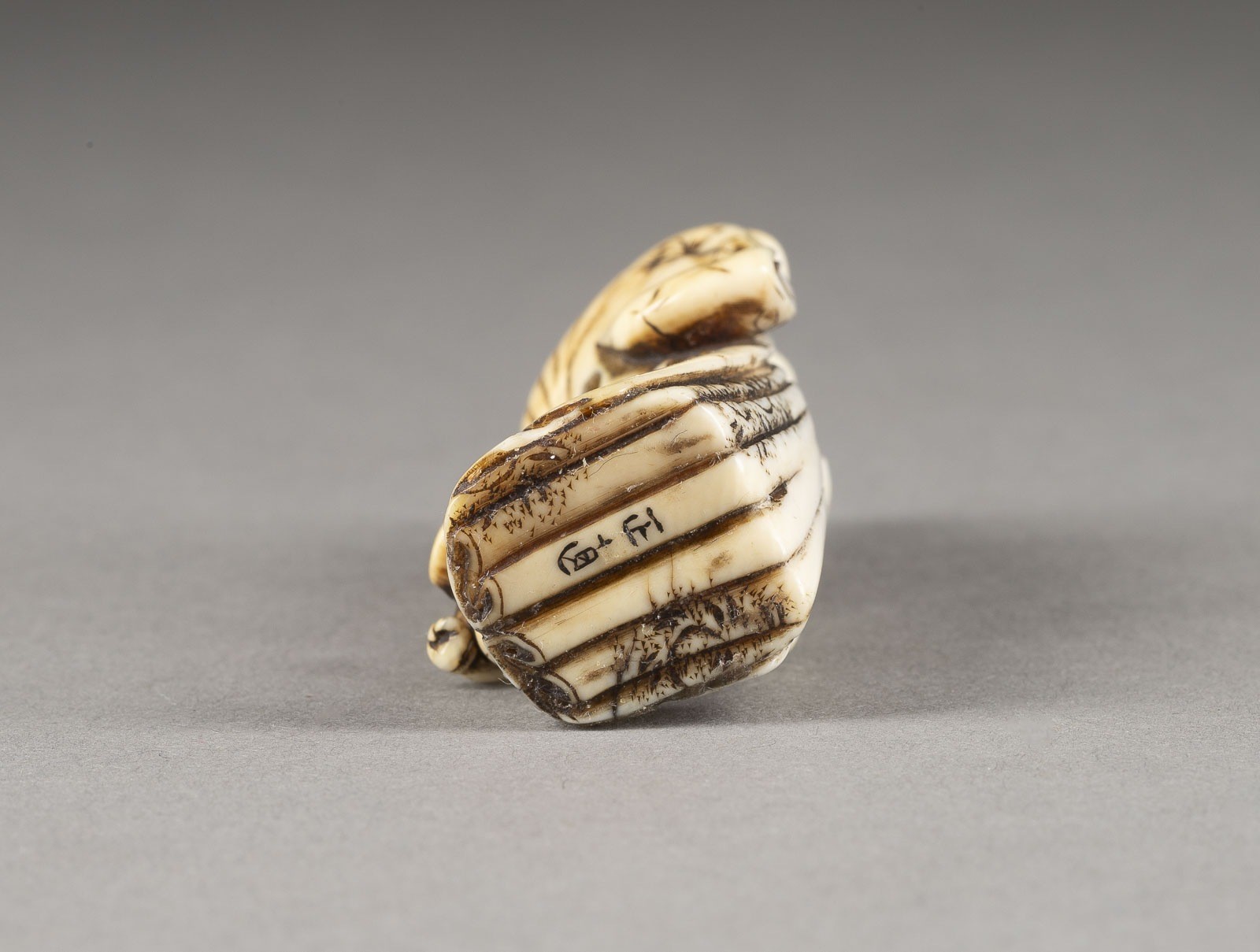 Elfenbein. H. 5.8 cm. Das Netsuke ist als Okame geschnizt, die Bohnen wirft, um die Oni hinter sich zu
