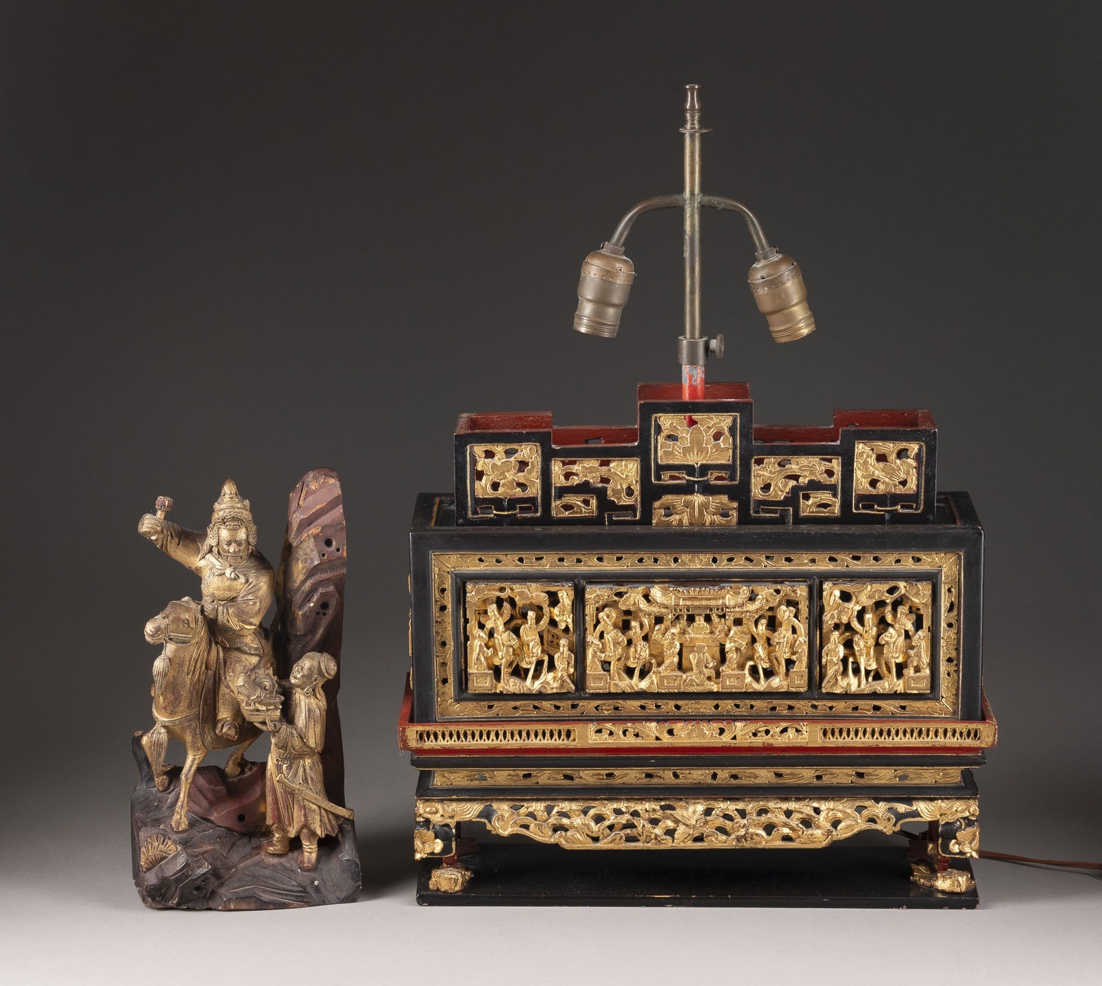 EIN GOLDLACKIERTER ALTARKASTEN ALS LAMPE UND EINE LACKIERTE HOLZGESCHNITZTE FIGUR