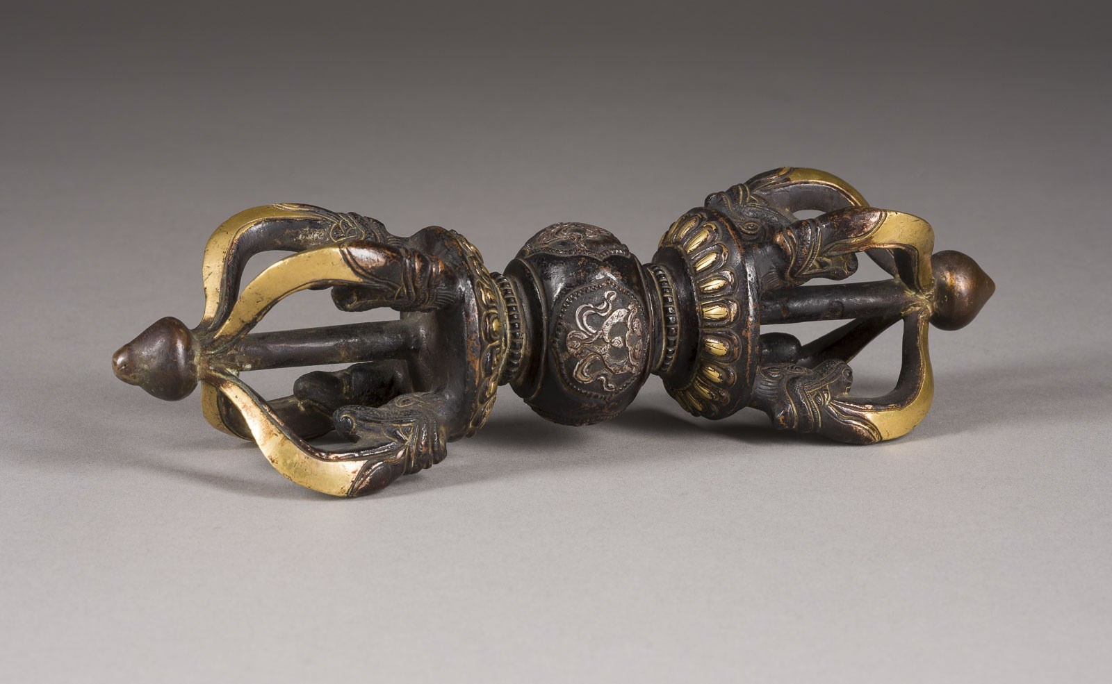 Bronze. L. 20,5 cm. Der Vajra mit einem zusammengedrückten kugelförmigen Zentralgriff, verziert mit vier der