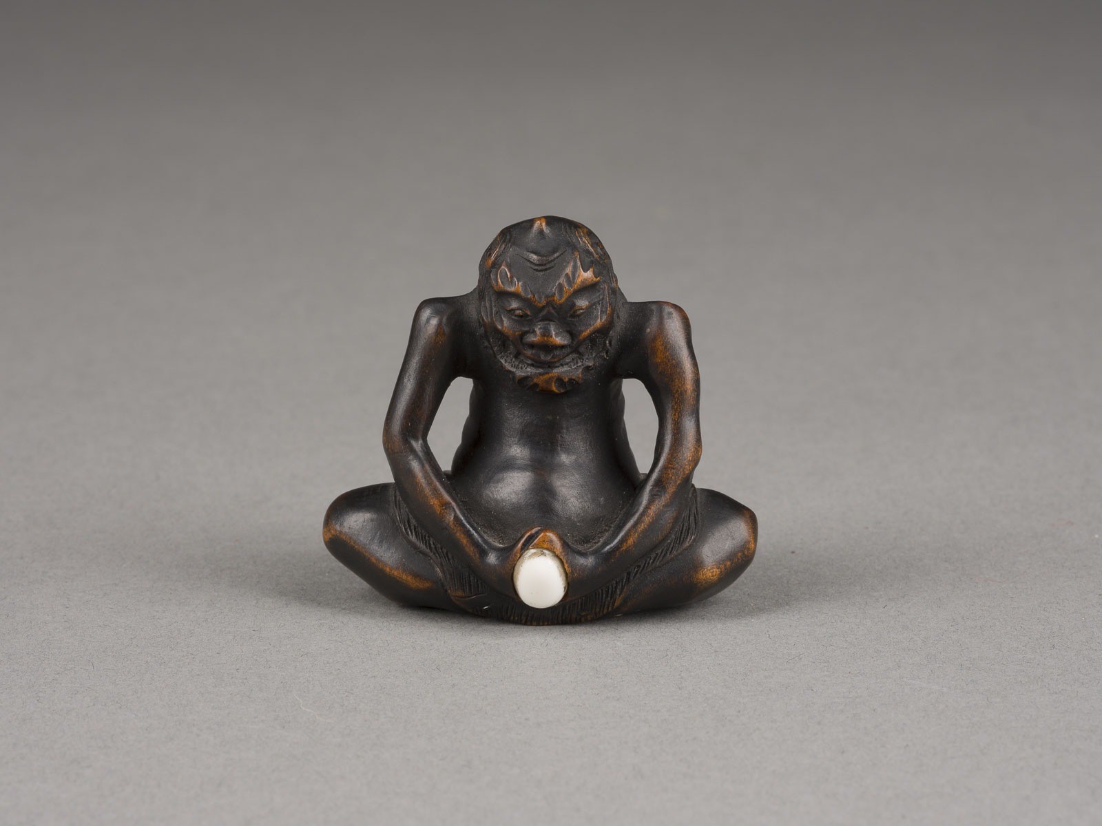 Holz. H. 4,3 cm. Das Netsuke ist als langhaariger, einhgehörniger Oni geschnitzt, der im Schneidersitz