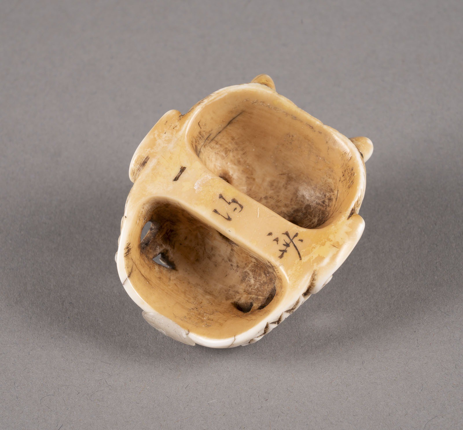 Elfenbein. H. 4,5 cm. Signiert "Ittokusai" auf der Rückseite. Mit Altersspuren und Gebrauchsspuren sowie Rissen.