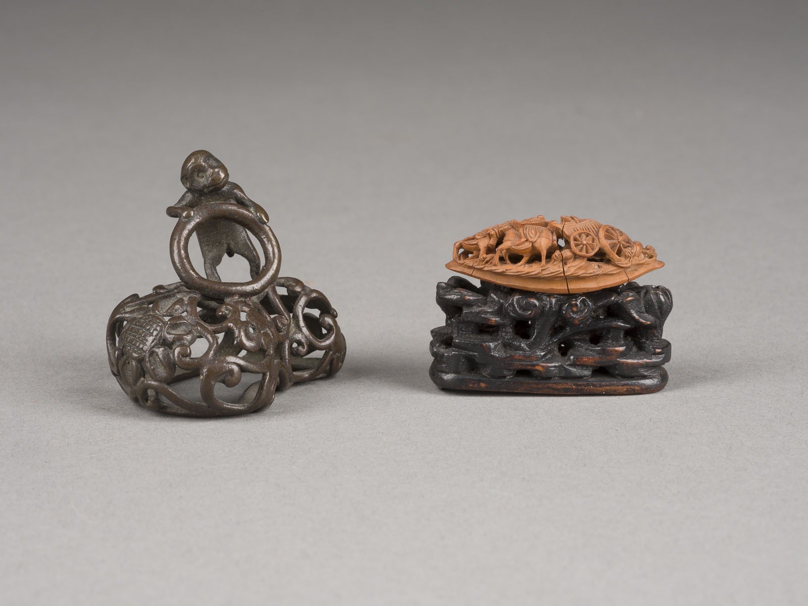 EIN NETSUKE AUS BRONZE UND EIN GESCHNITZTES BOOT AUS EINEM OLIVENSTEIN