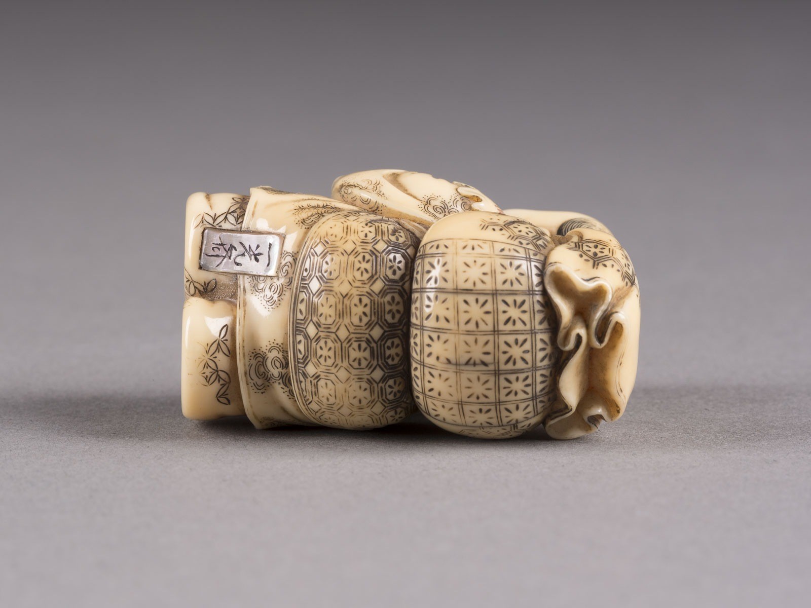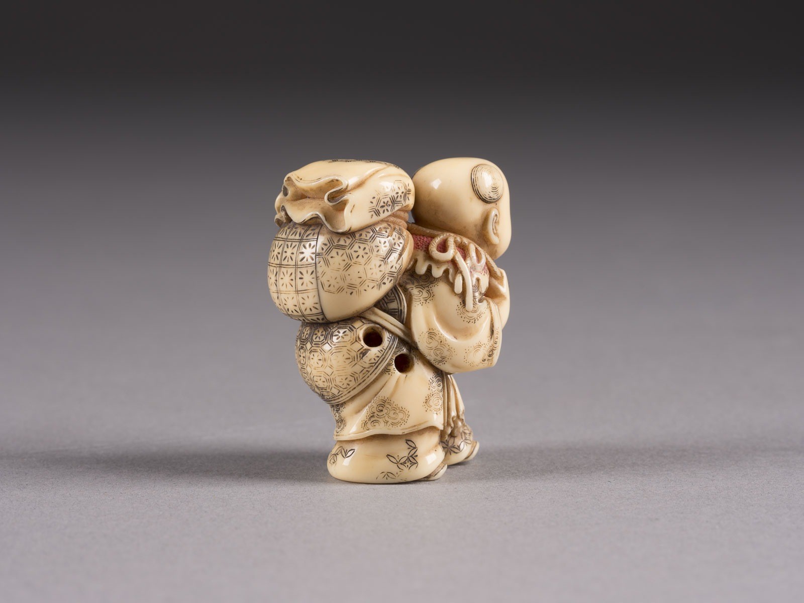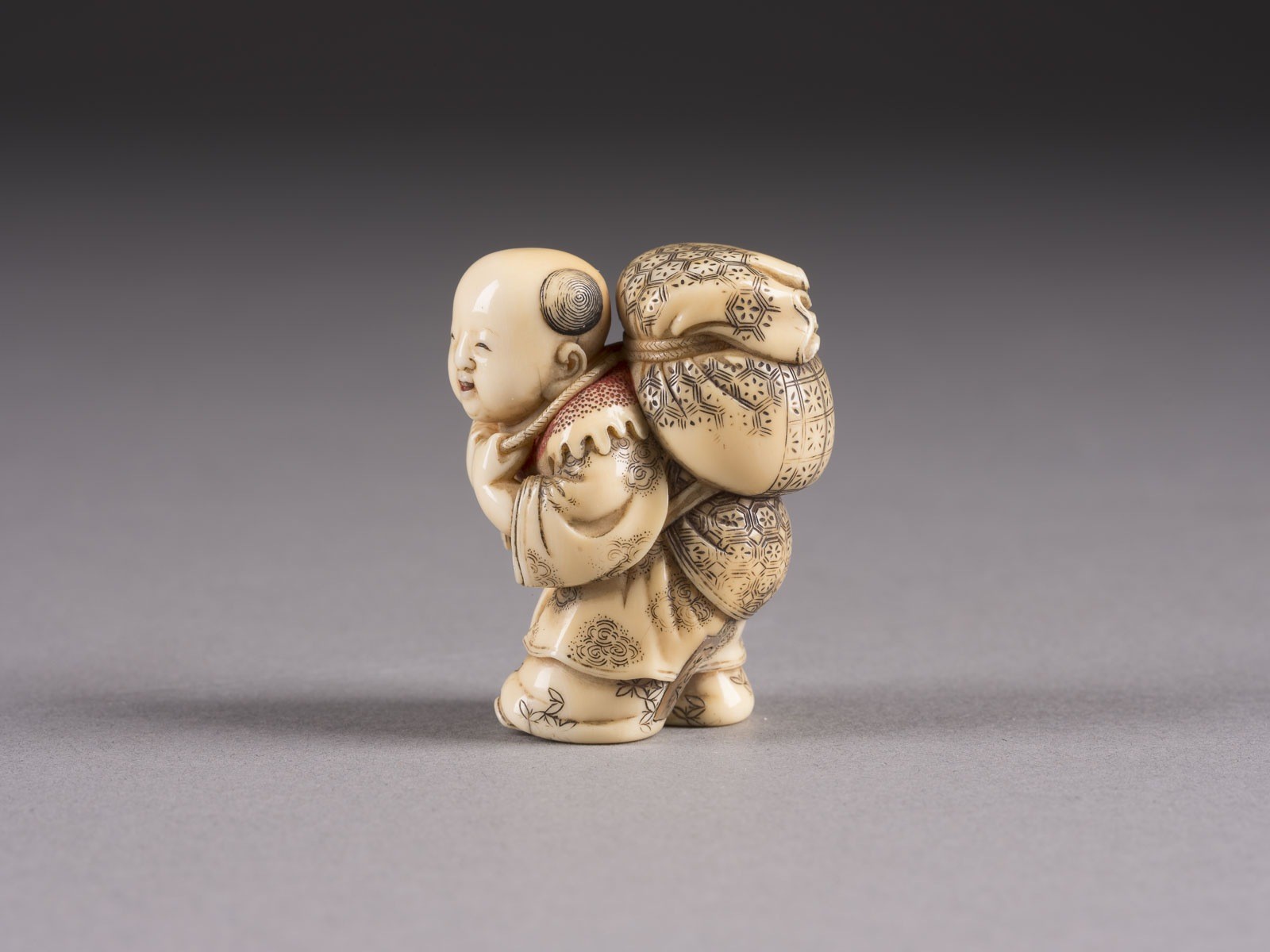 Elfenbein. H. 4,1 cm. Das Netsuke ist als Karako geschnitzt, der einen großen Sack auf dem Rücken trägt, mit der