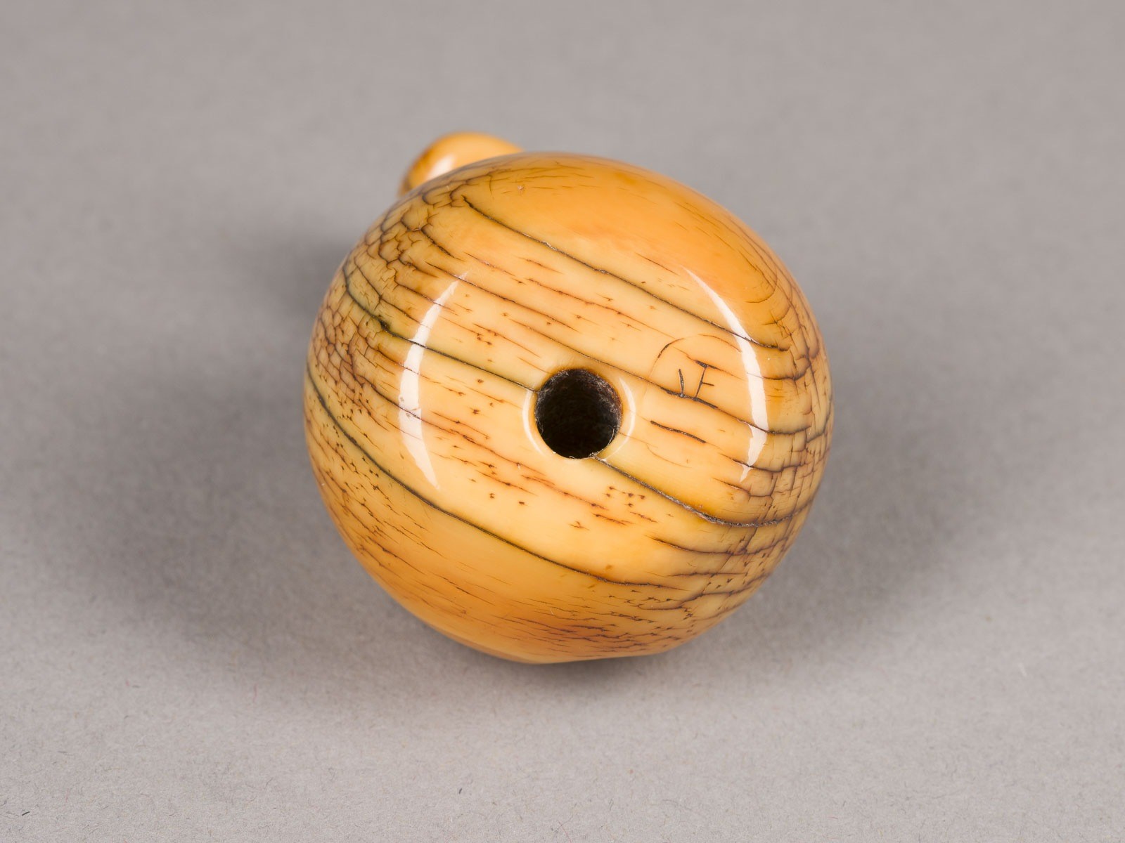 Walrosszahn. H. 4,3 cm. Das Netsuke ist als Koko Sennin geschnitzt, der in seiner Almosenschale sitzt. Unten in