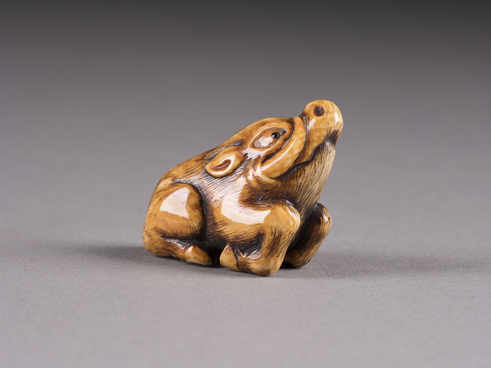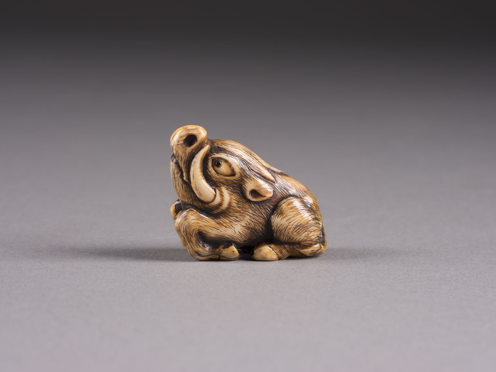 EIN NETSUKE EINES LIEGENDEN EBERS AUS ELFENBEIN