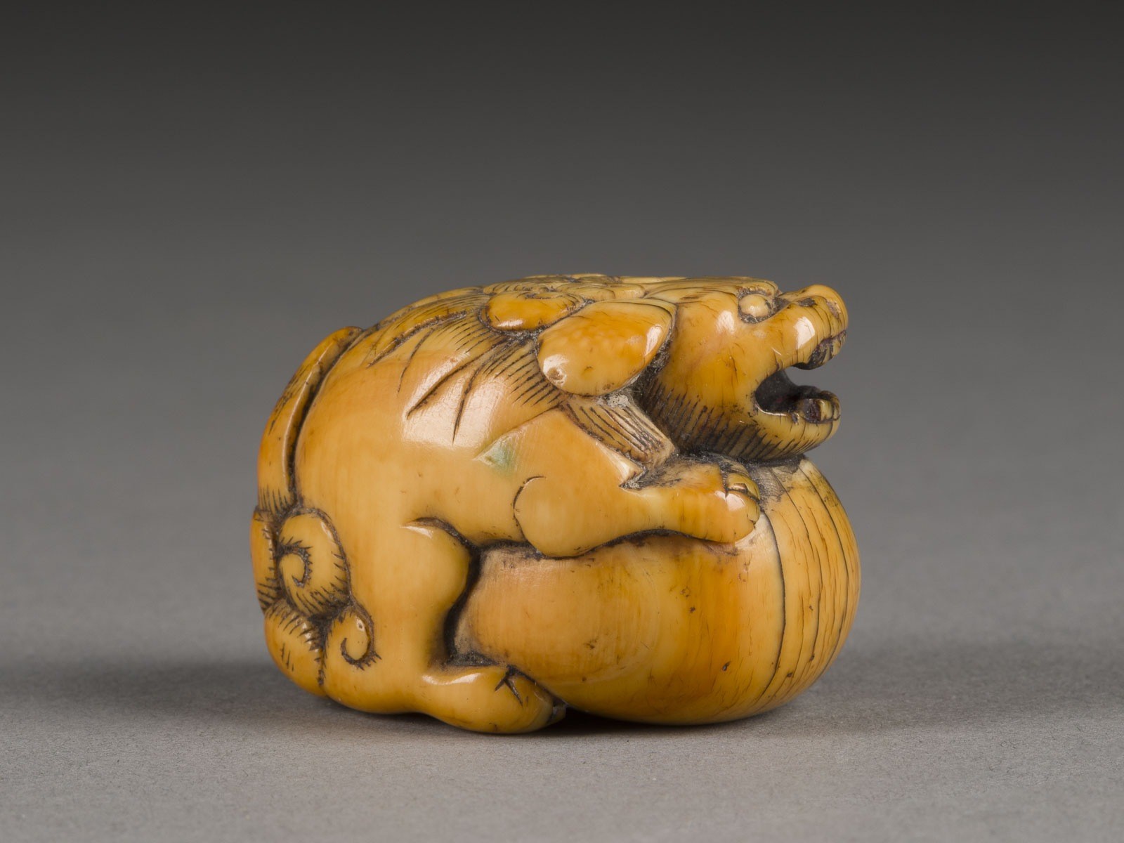 EIN NETSUKE EINES SHISHI MIT KUGEL AUS ELFENBEIN