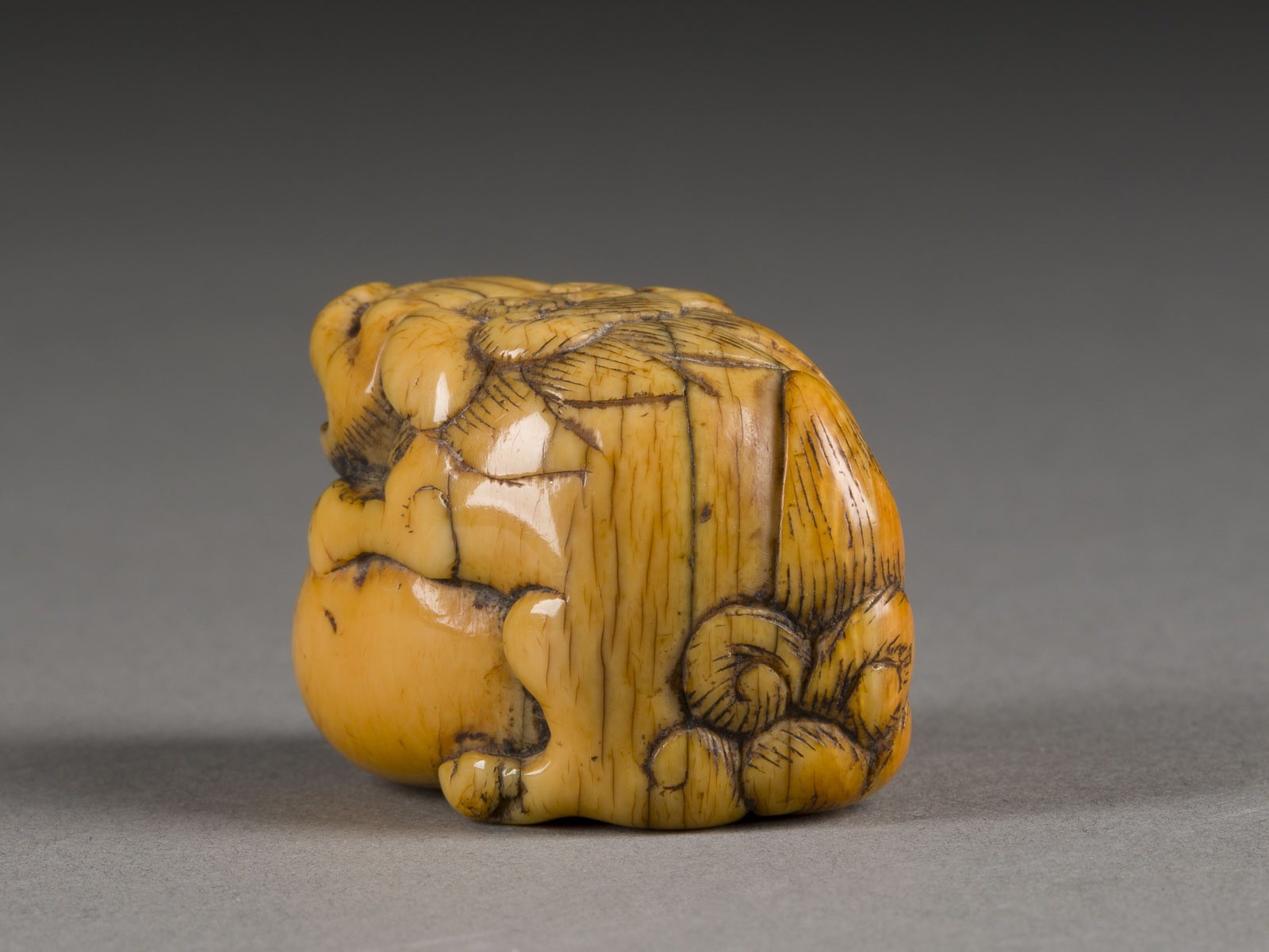 Elfenbein. H. 2,8 cm. Das Netsuke ist als Shishi mit offenem Maul geschnitzt, der auf seinen Hinterbeinen sitzt