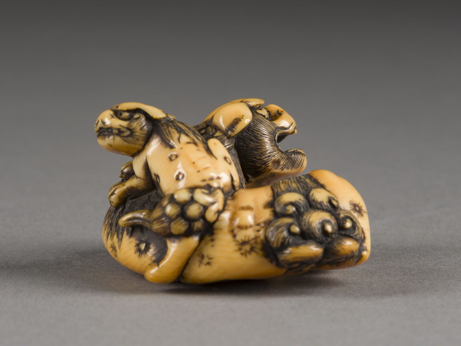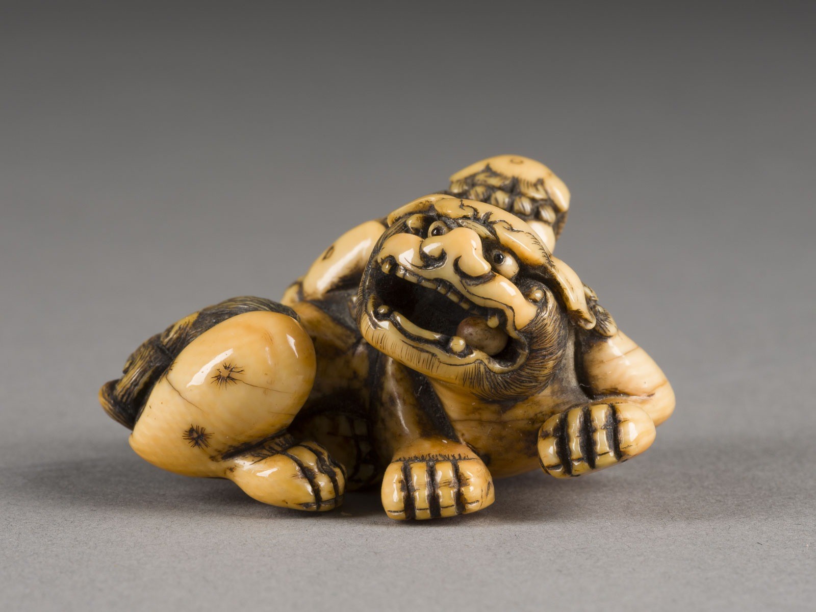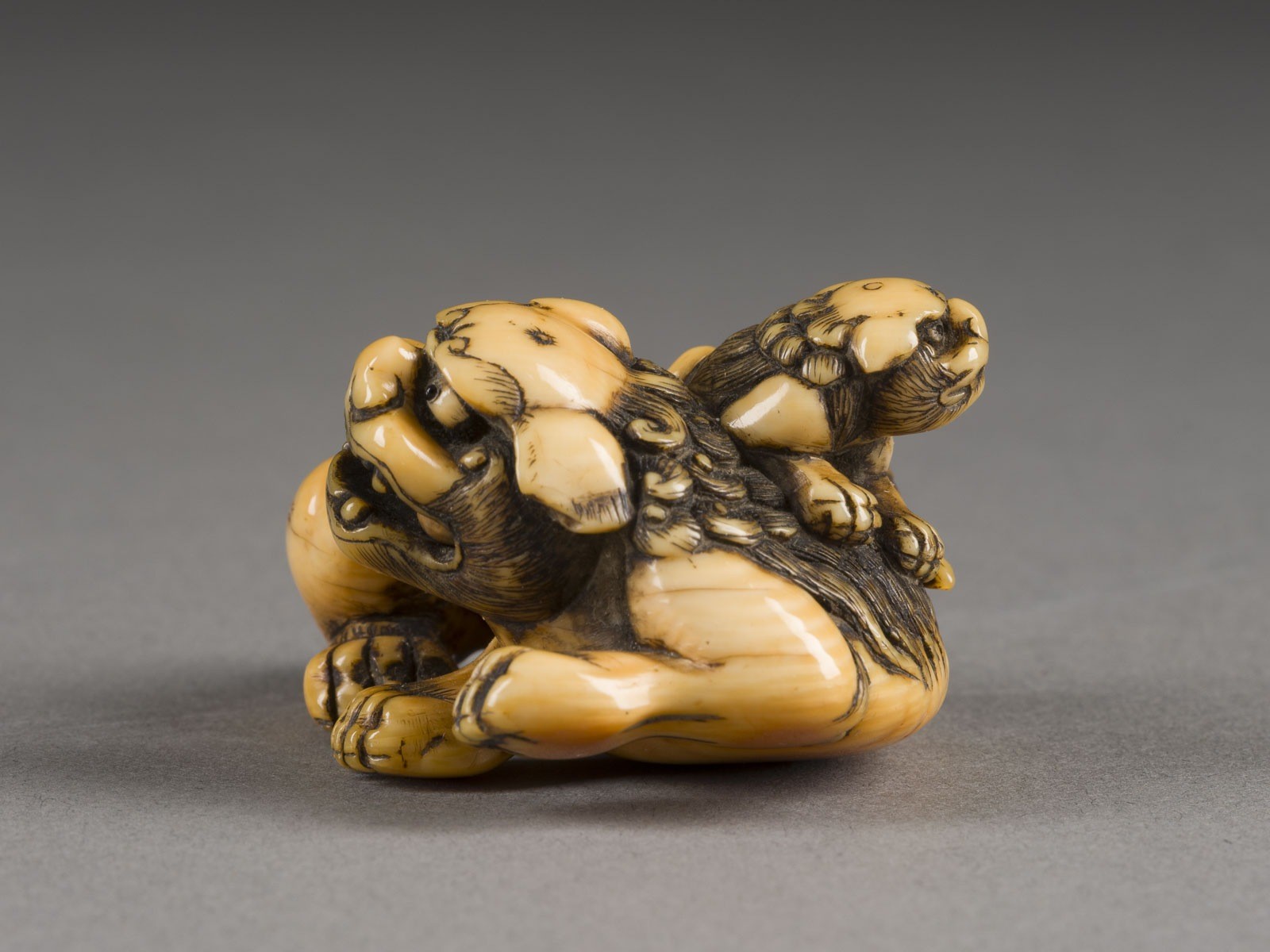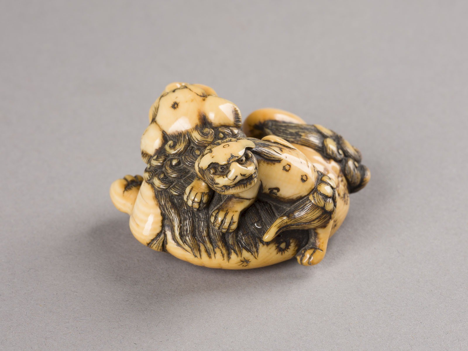 EIN NETSUKE EINES SHISHI UND SEINES JUNGEN AUS ELFENBEIN