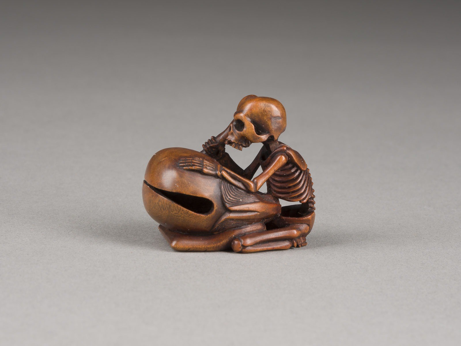 Holz. H. 3,8 cm. Das Netsuke ist als Skelett geschnitzt, das hinter einem großen Mokugyo auf einem