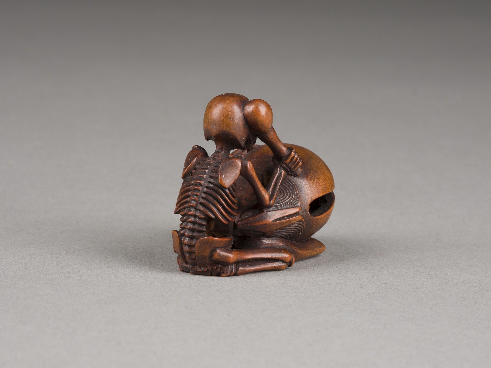 EIN NETSUKE EINES SKELETTEN MIT MOKUGYO AUS HOLZ