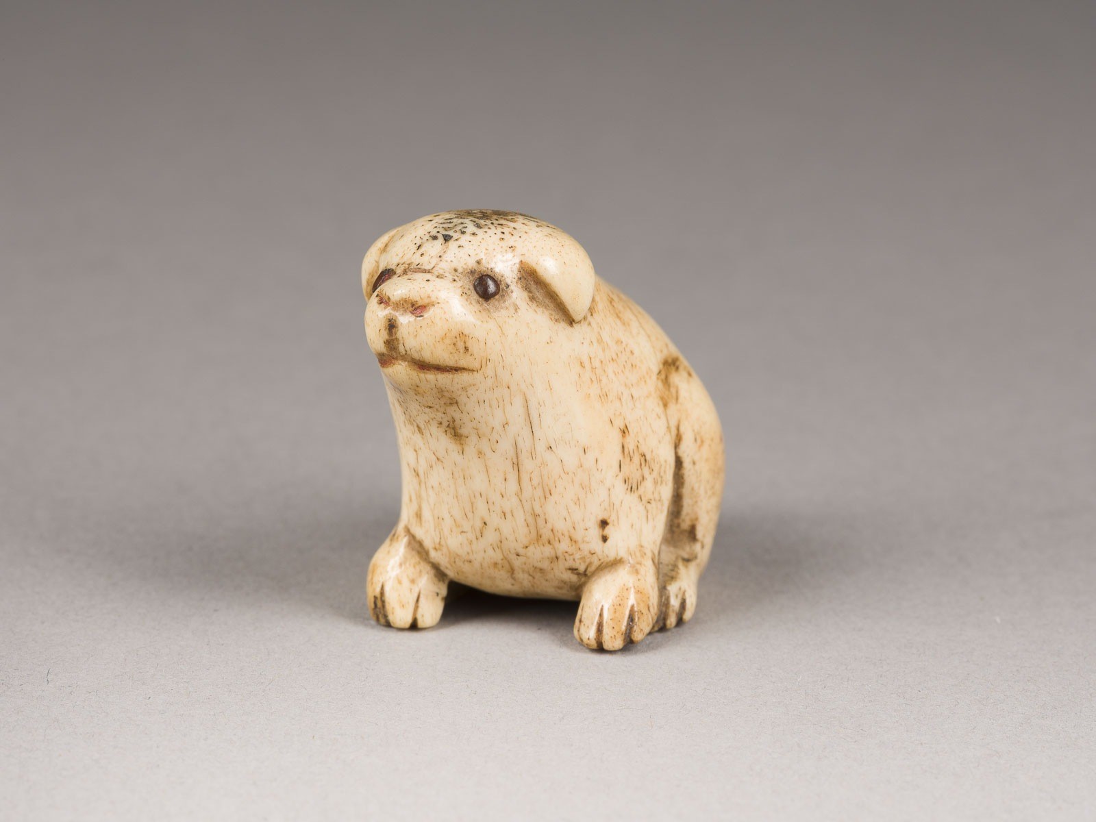Hirschhorn. H. 3,5 cm. Das Netsuke ist als sitzender Welpe mit eingelegten Augen geschnitzt. Part. ber., mit Gebrauchs- und Altersspuren sowie Rissen.