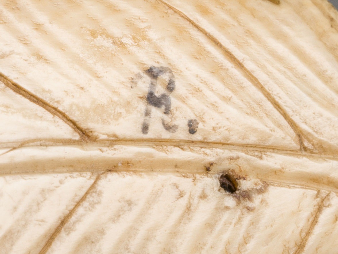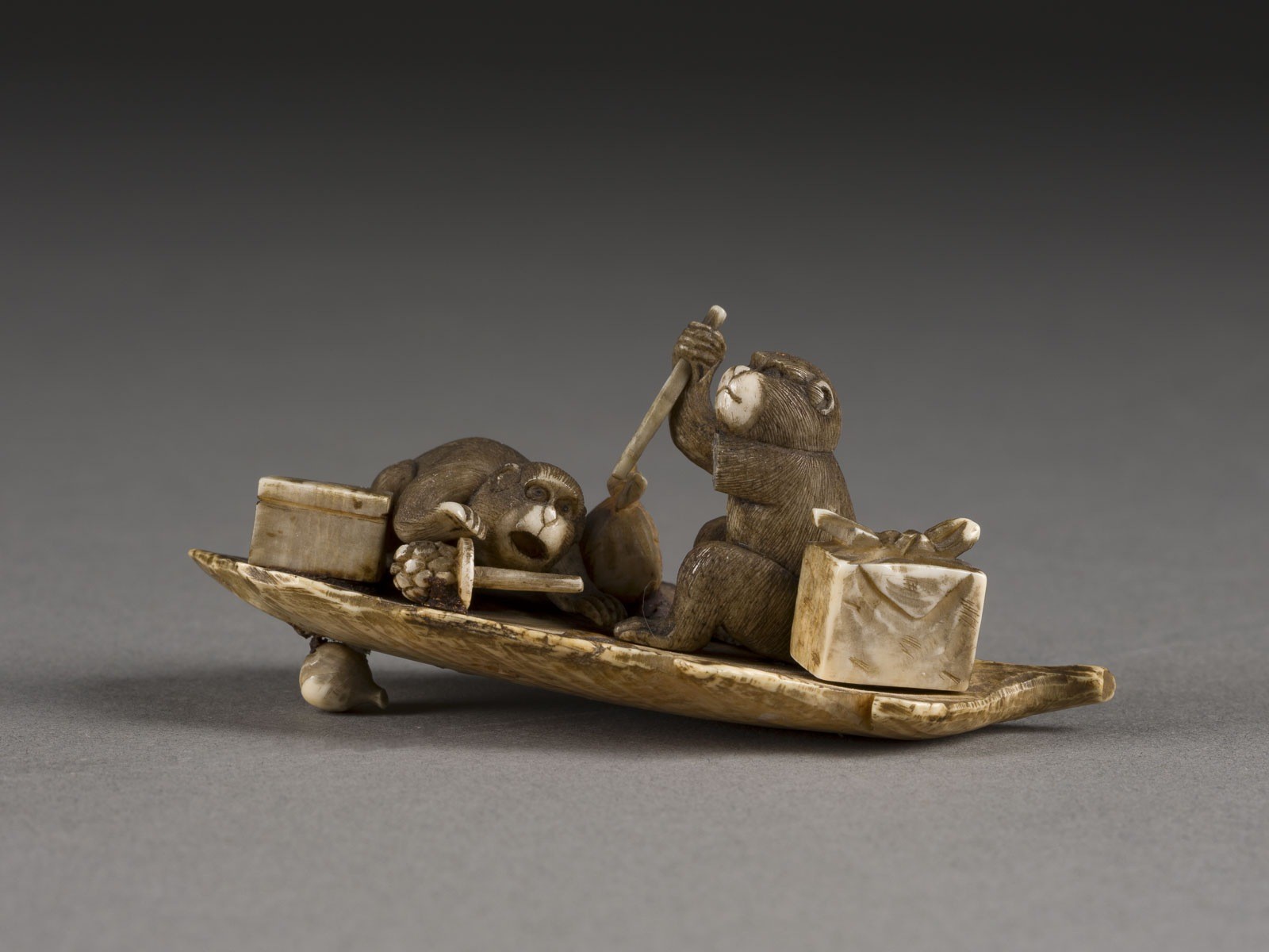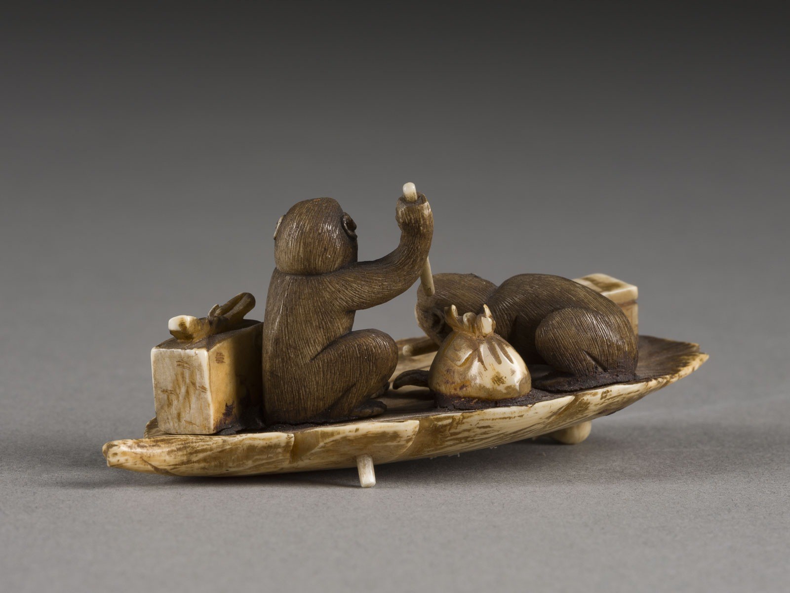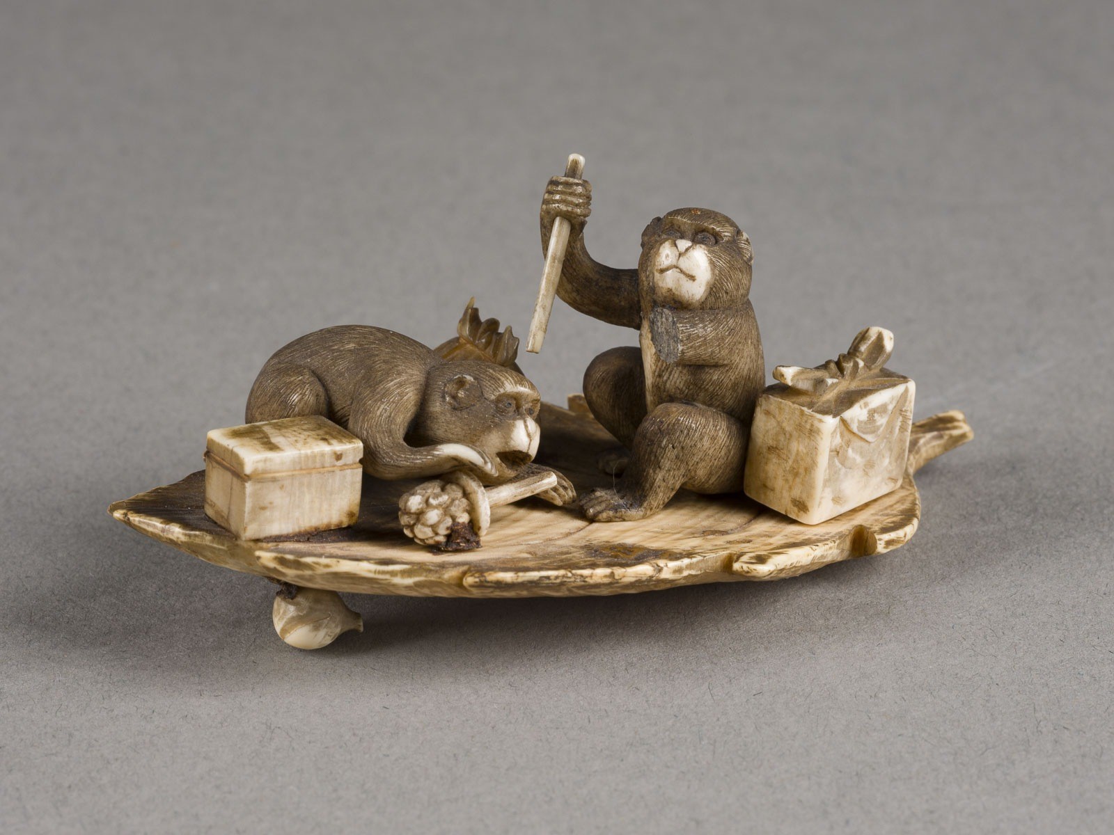 Elfenbein. L. 7,1 cm. Das Okimono ist als zwei auf einem großen Blatt ruhende Affen geschnitzt, neben ihnen