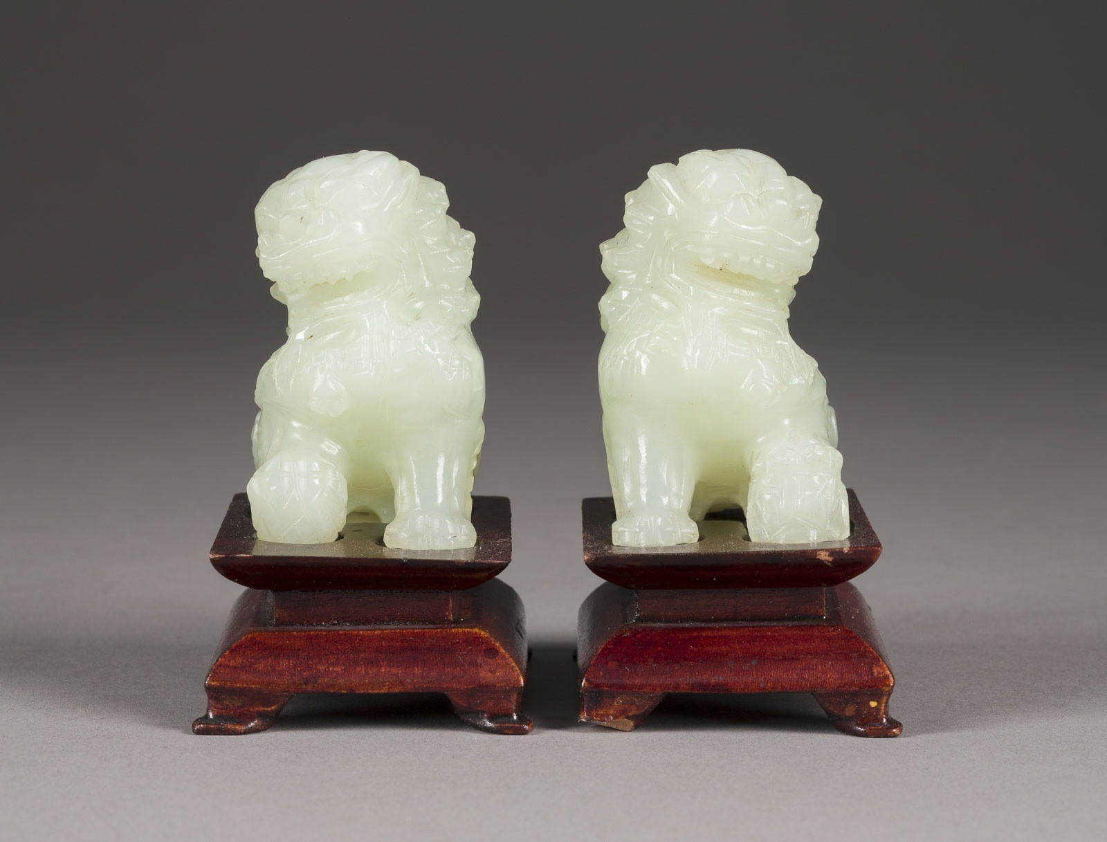 EIN PAAR BUDDHISTISCHE LÖWEN AUS HELLGRÜNER JADE