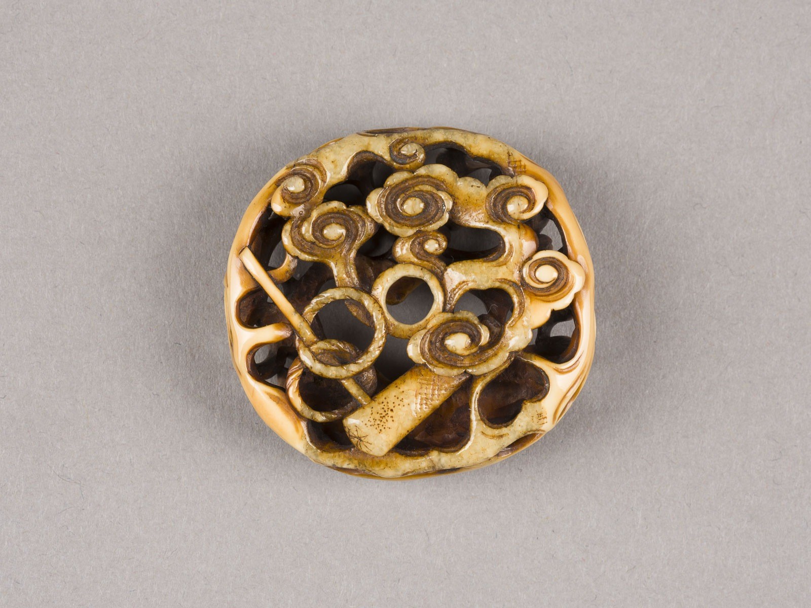 Walrosszahn. L. ca. 4 cm. Das Netsuke ist durchbrochen geschnitzt und zeigt auf der einen Seite Blumen und Vögel,