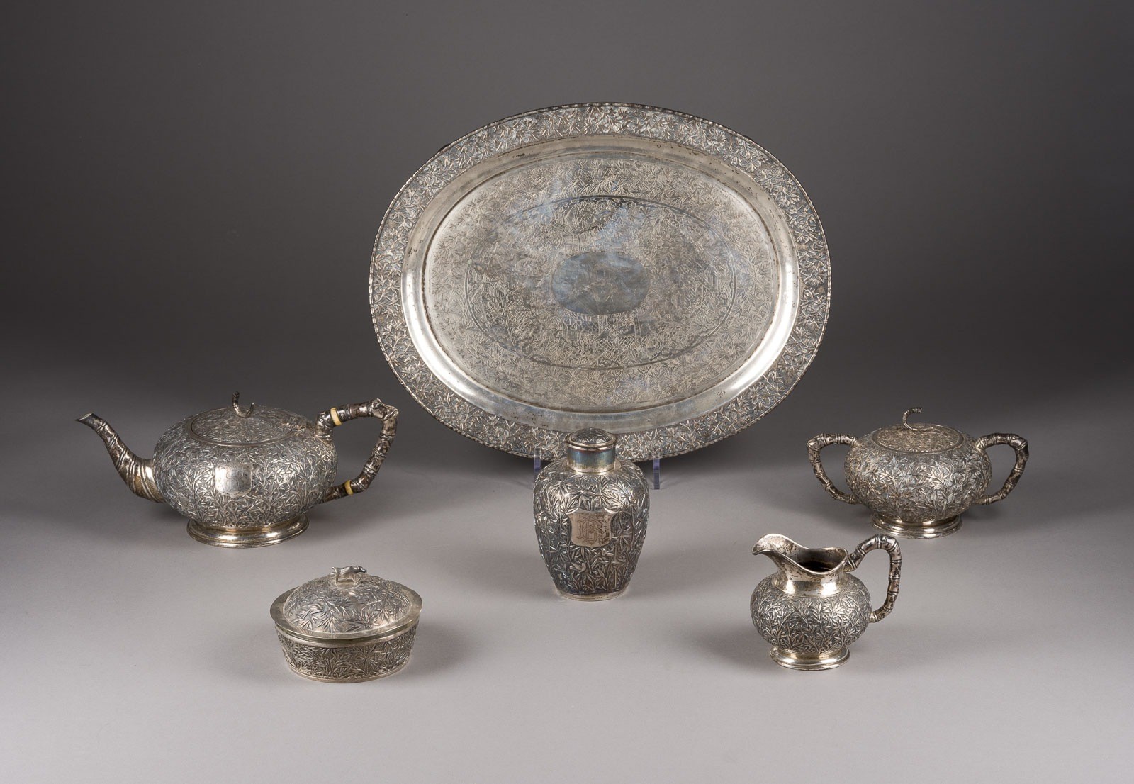 EIN SECHSTEILIGES CHINESISCHES EXPORT-TEESERVICE AUS SILBER MIT BAMBUSDEKOR