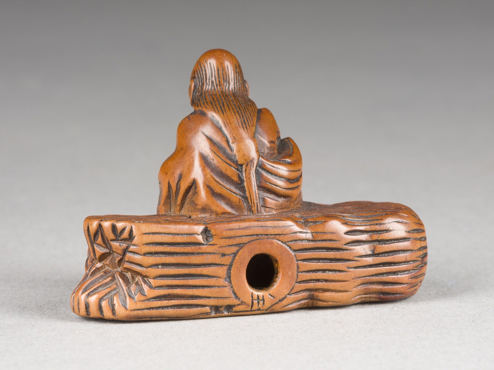 Holz. L. 4,9 cm. Das Netsuke ist als Sennin geschnitzt, der auf einem Baumstumpf sitzt und einen Hut und