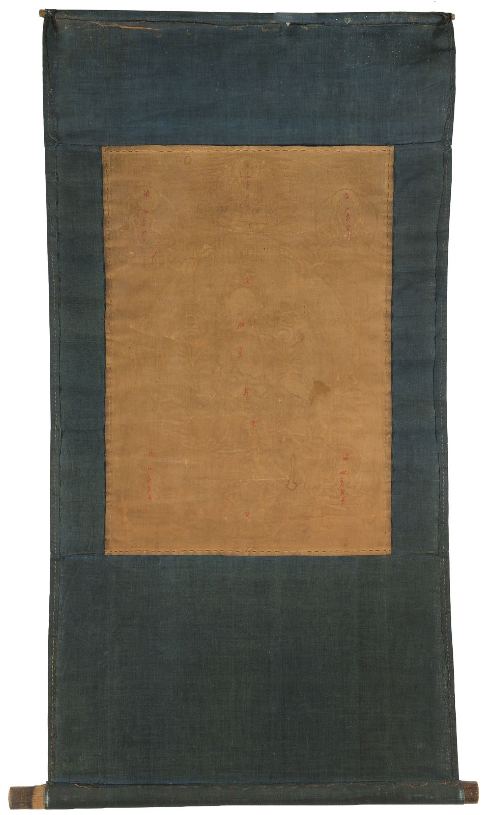 Buddhas und Bodhisattvas. Auf der Rückseite befinden sich Inschriften. Mit Altersspuren, leicht beschädigt.