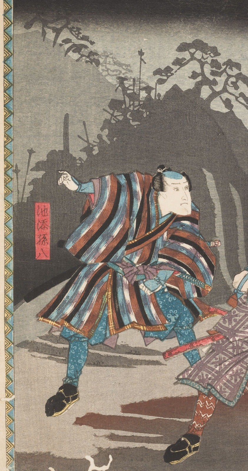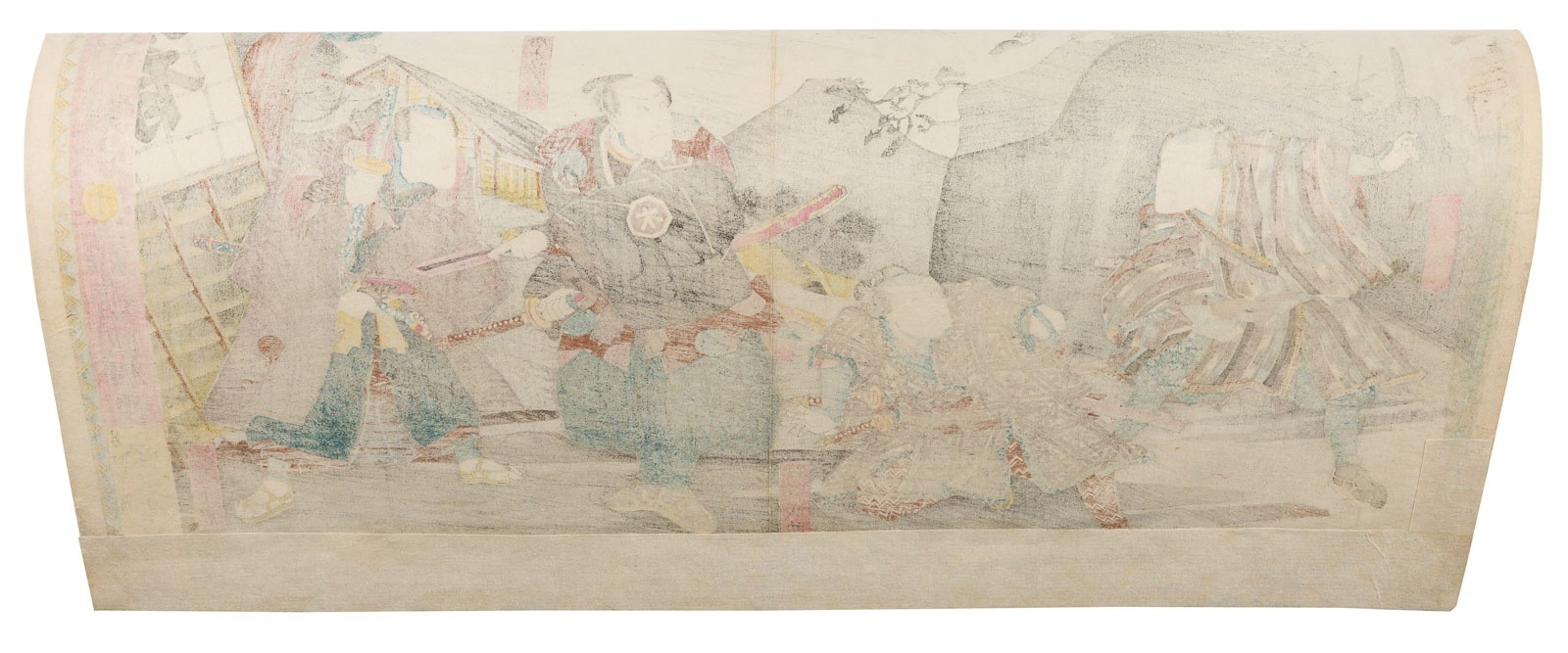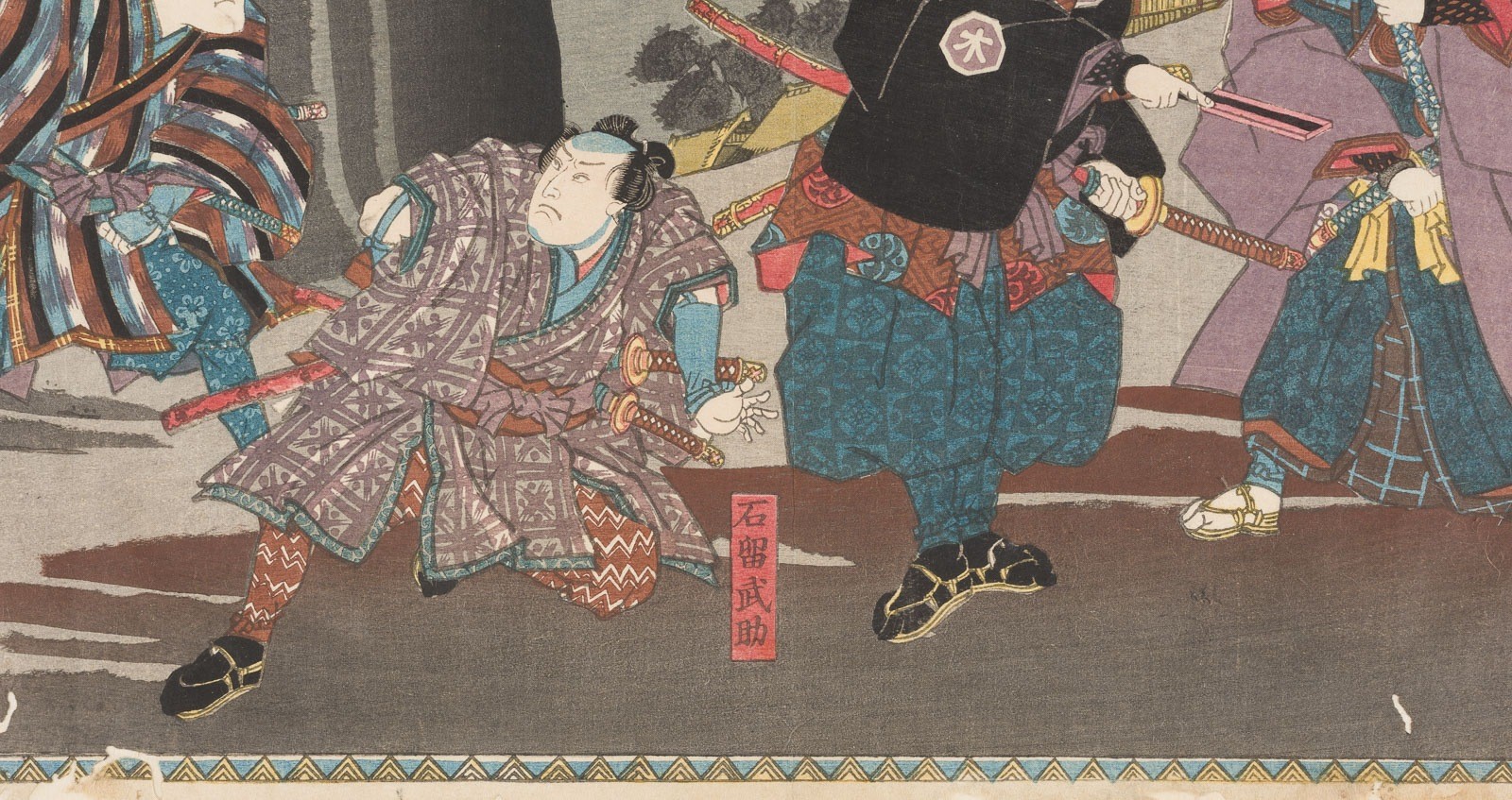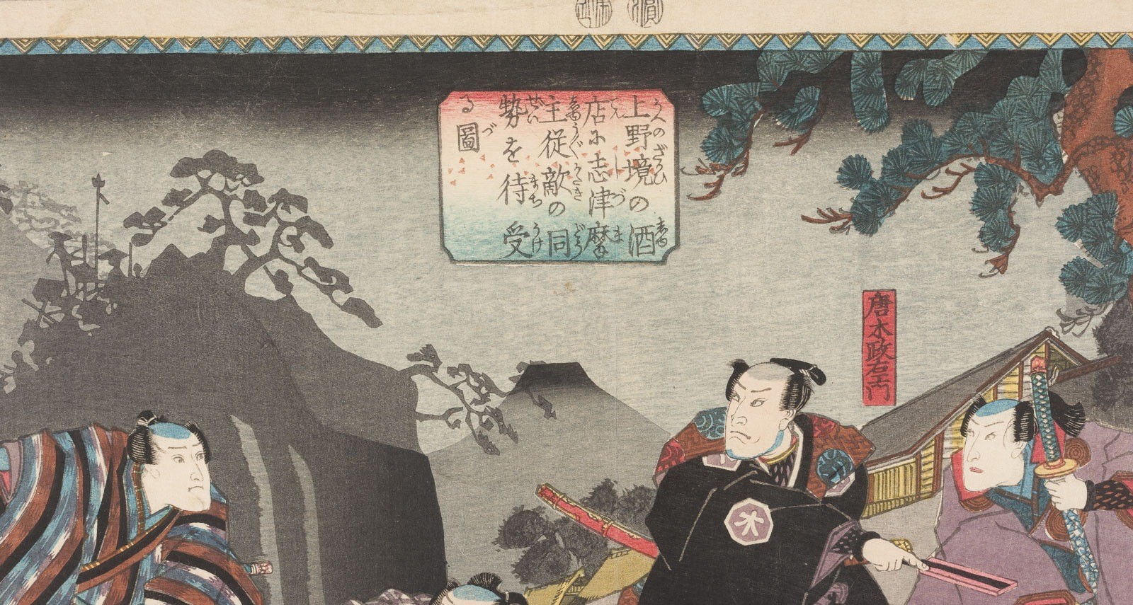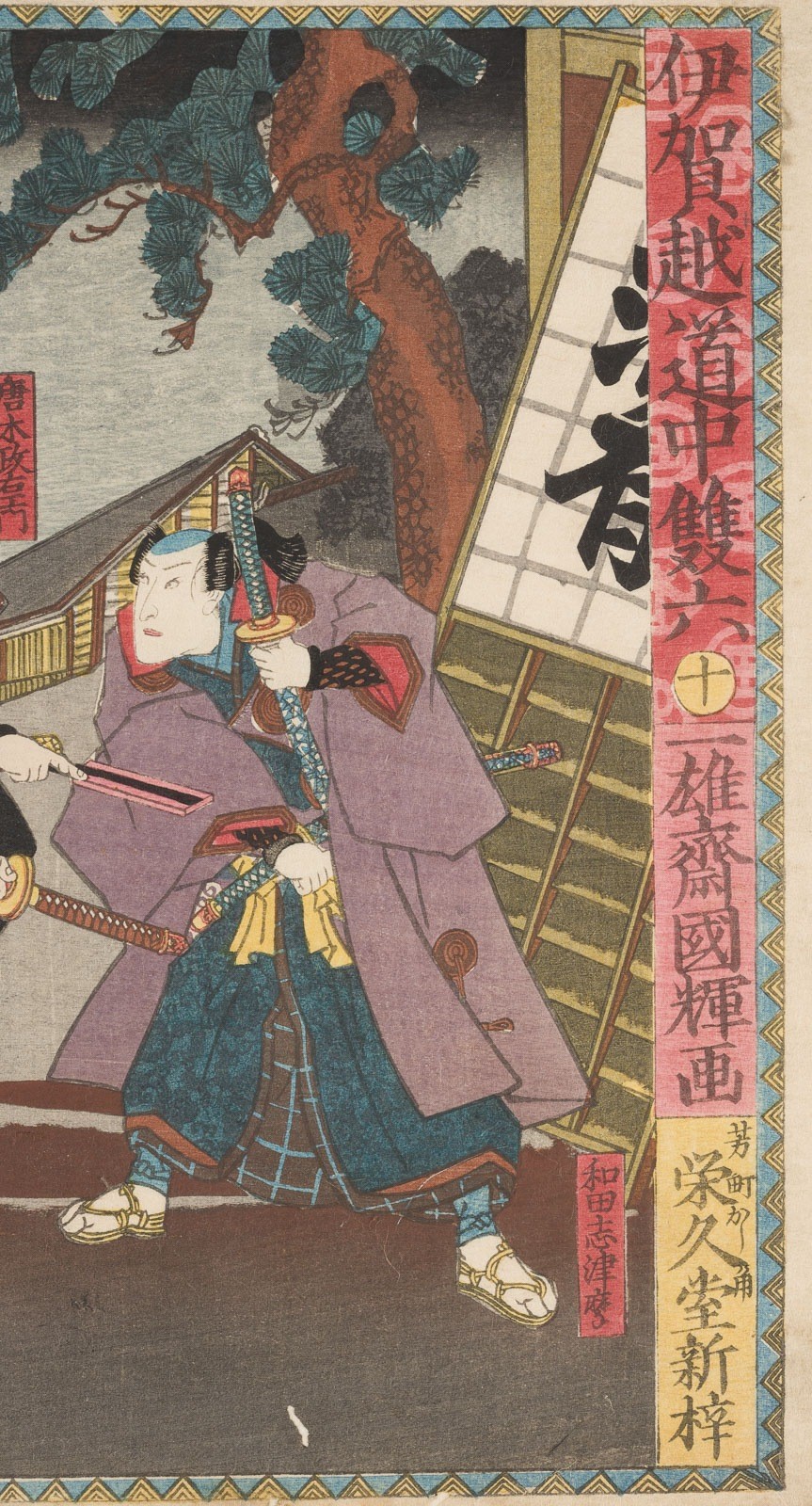 Holzschnitt. Ca. 36,3 × 24,3 cm. Aus der Serie "Igagoe Dochu Sugoroku Hachi. Mit Zensurstempeln "Magomi-Hama". Mit Altersspuren, teilw. besch..
