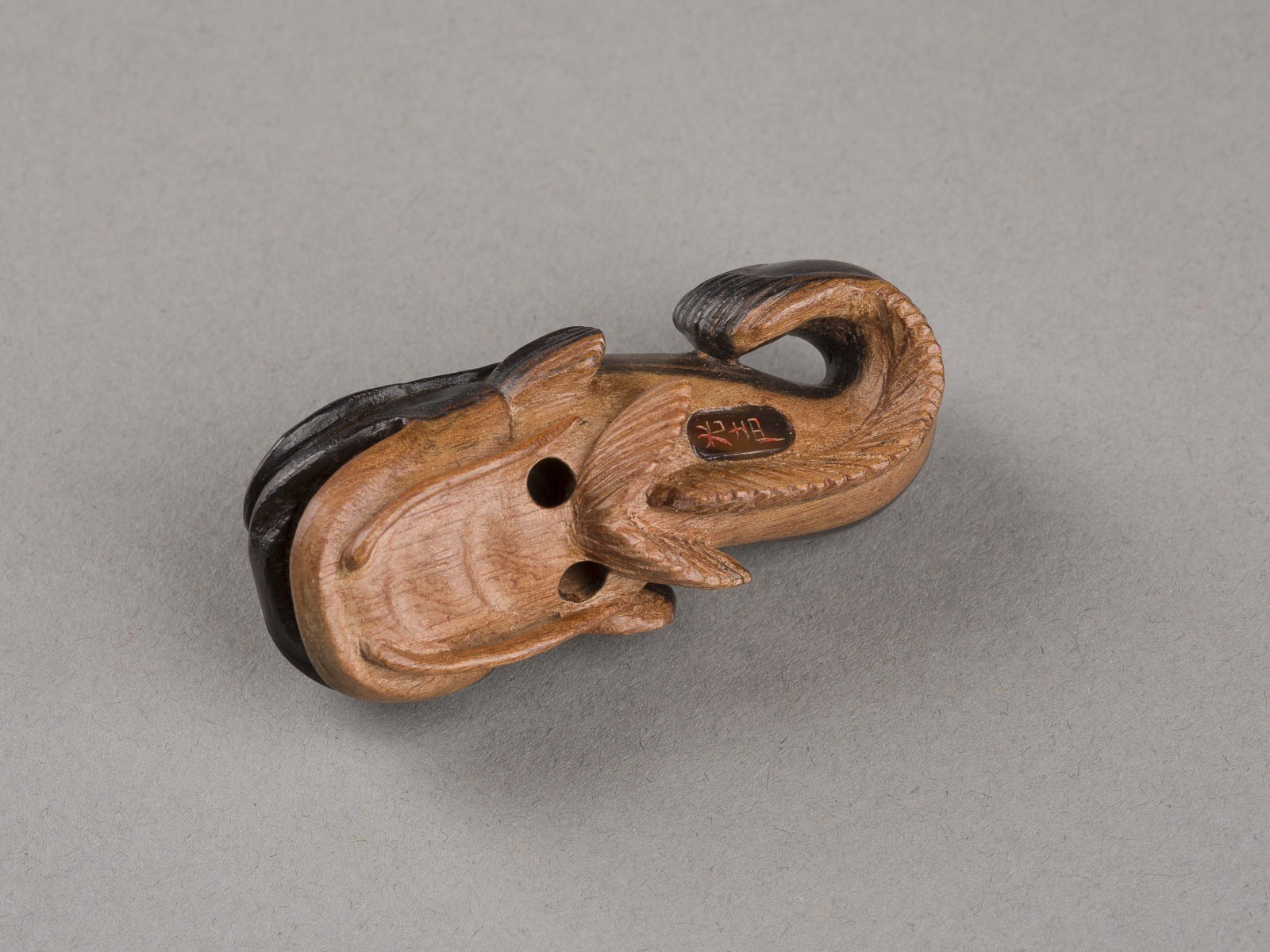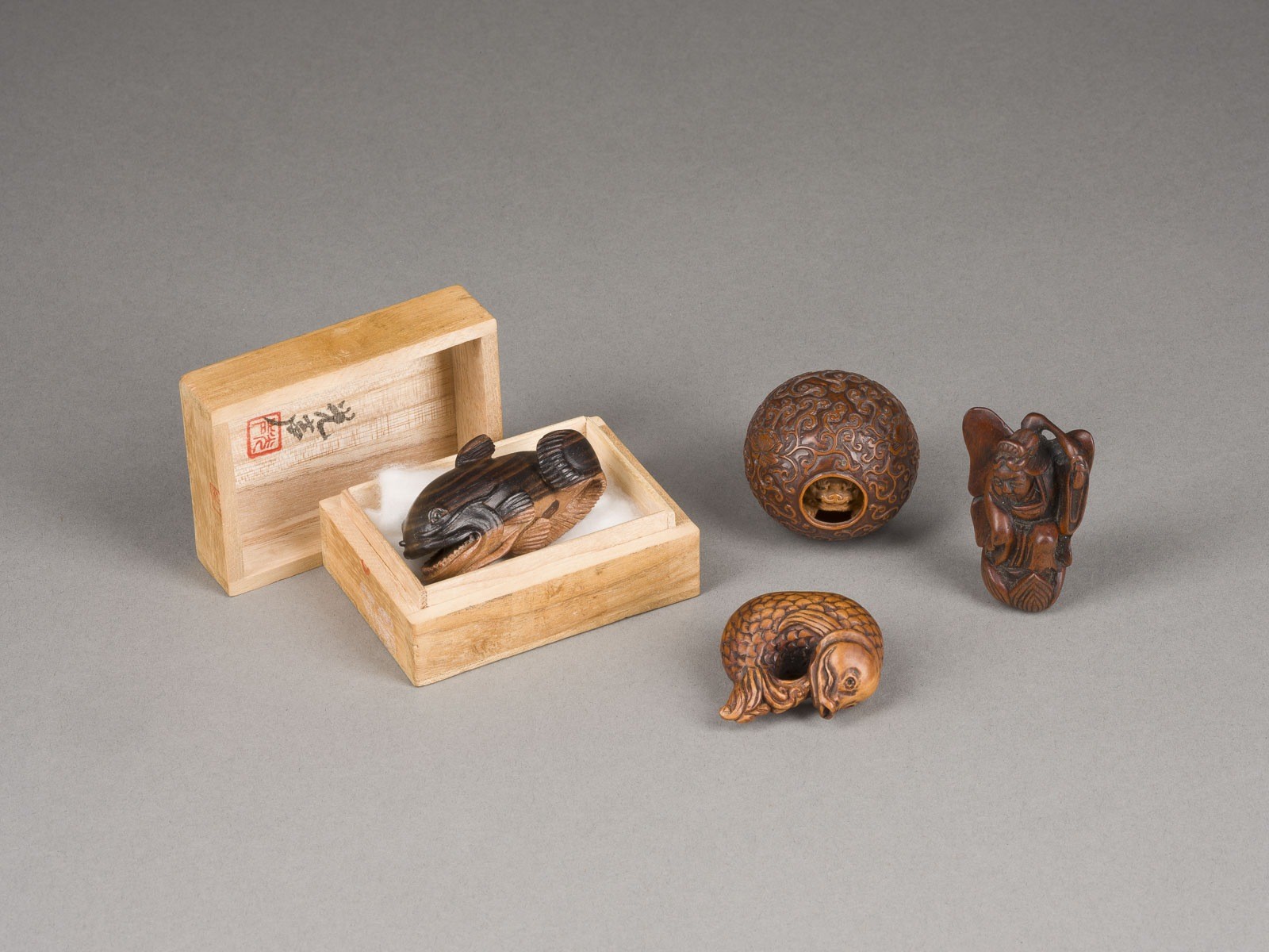 Holz. H. 3,1-4,8 cm. Darunter ein Netsuke in Form eines Fisches, eines Mokugyo, einer Figur sowie ein fein